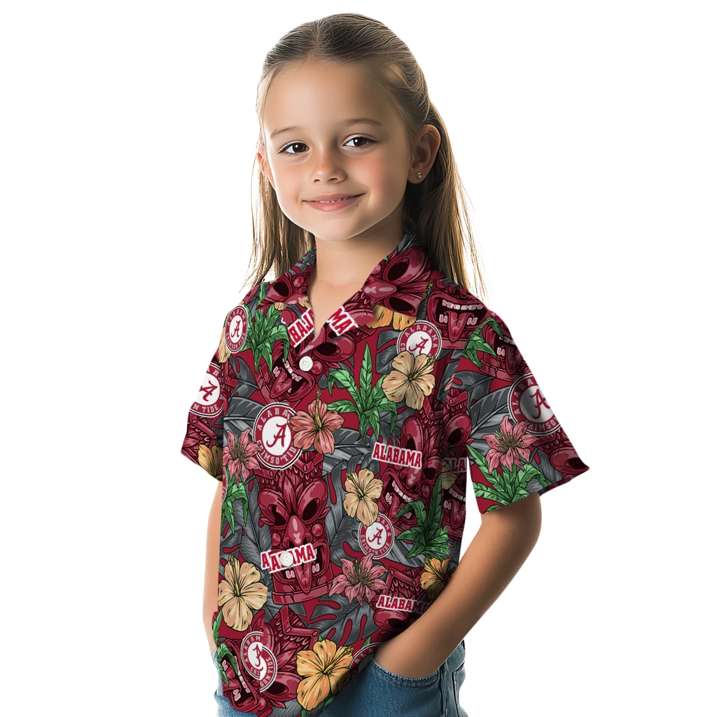 Show your Alabama Crimson Tide spirit in tropical style. Hibiscus tiki jungle design with tropical leaves, jungle, beach, and team logo for a bold style. Available for men, women and kids. Great for matching looks.