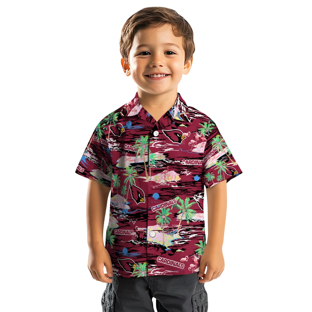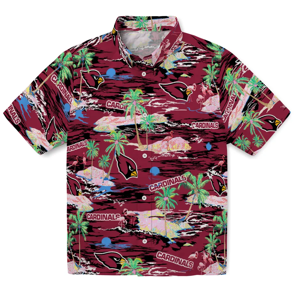 Show your Arizona Cardinals spirit in tropical style. Beach island scenes with flamingos and team logo for a summer-ready Hawaiian shirt. Available for men, women and kids. Great for matching looks.