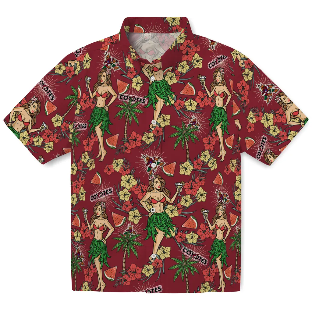 Show your Arizona Coyotes spirit in tropical style. Colorful Hula girls illustration with tropical motifs and team logo for a playful design. Available for men, women and kids. Great for matching looks.