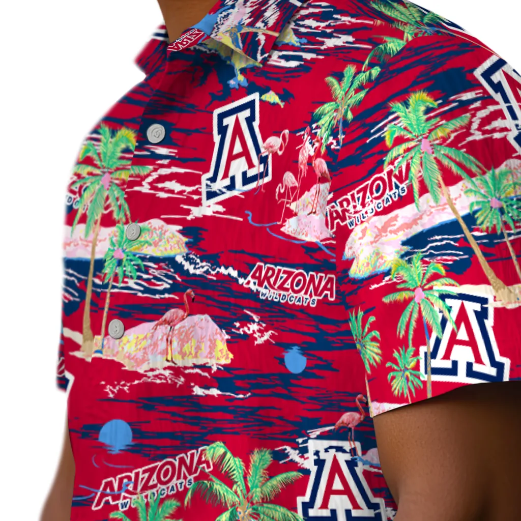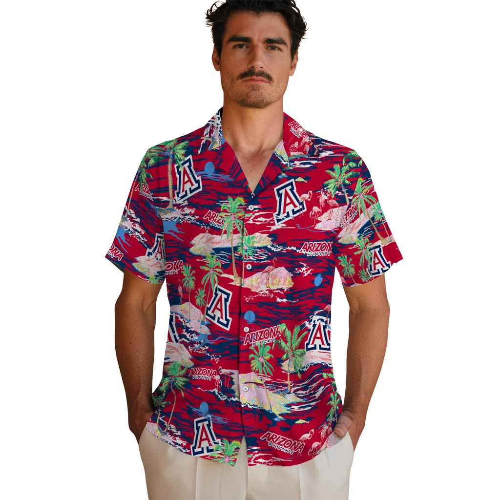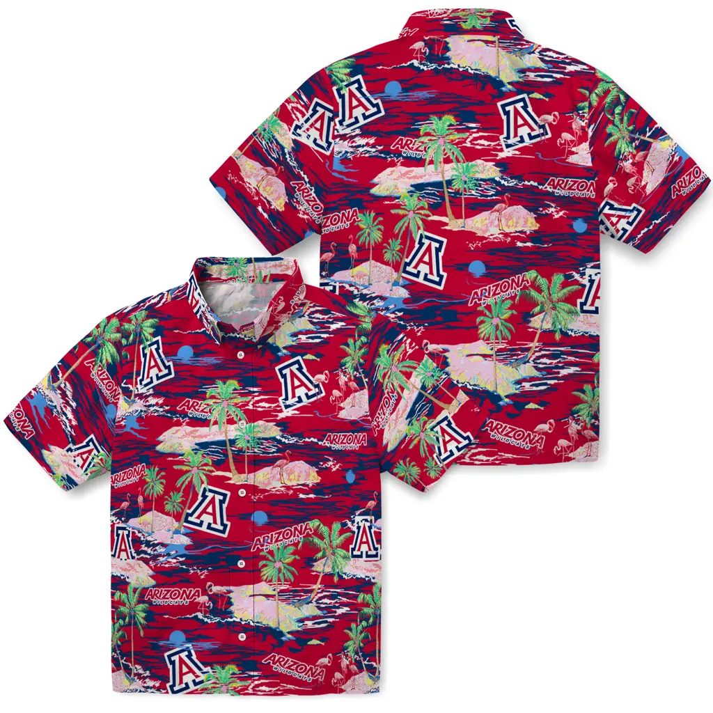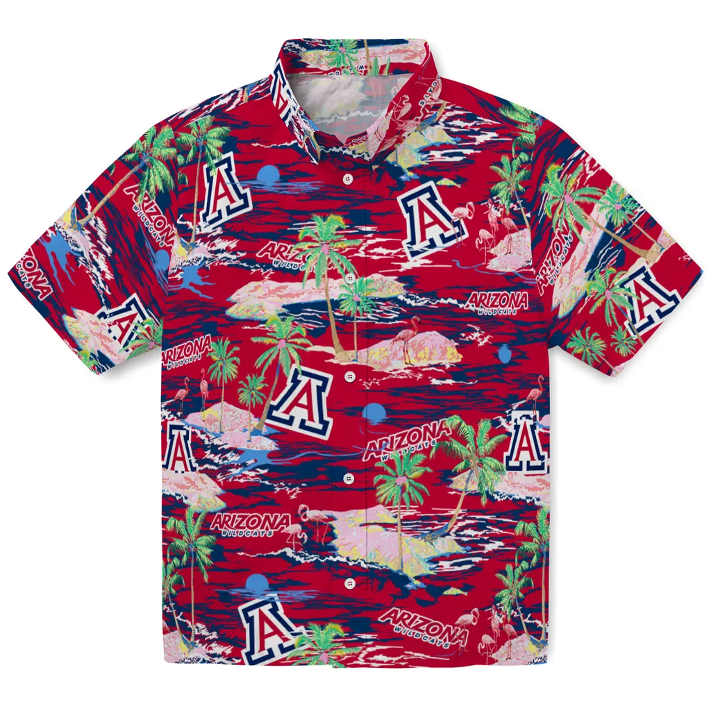 Show your Arizona Wildcats spirit in tropical style. Beach island scenes with flamingos and team logo for a summer-ready Hawaiian shirt. Available for men, women and kids. Great for matching looks.