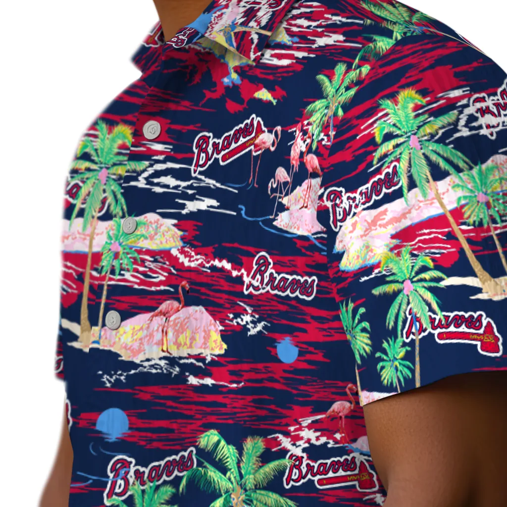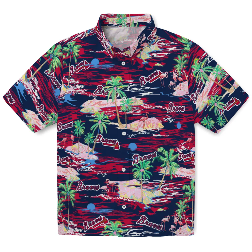 Show your Atlanta Braves spirit in tropical style. Beach island scenes with flamingos and team logo for a summer-ready Hawaiian shirt. Available for men, women and kids. Great for matching looks.