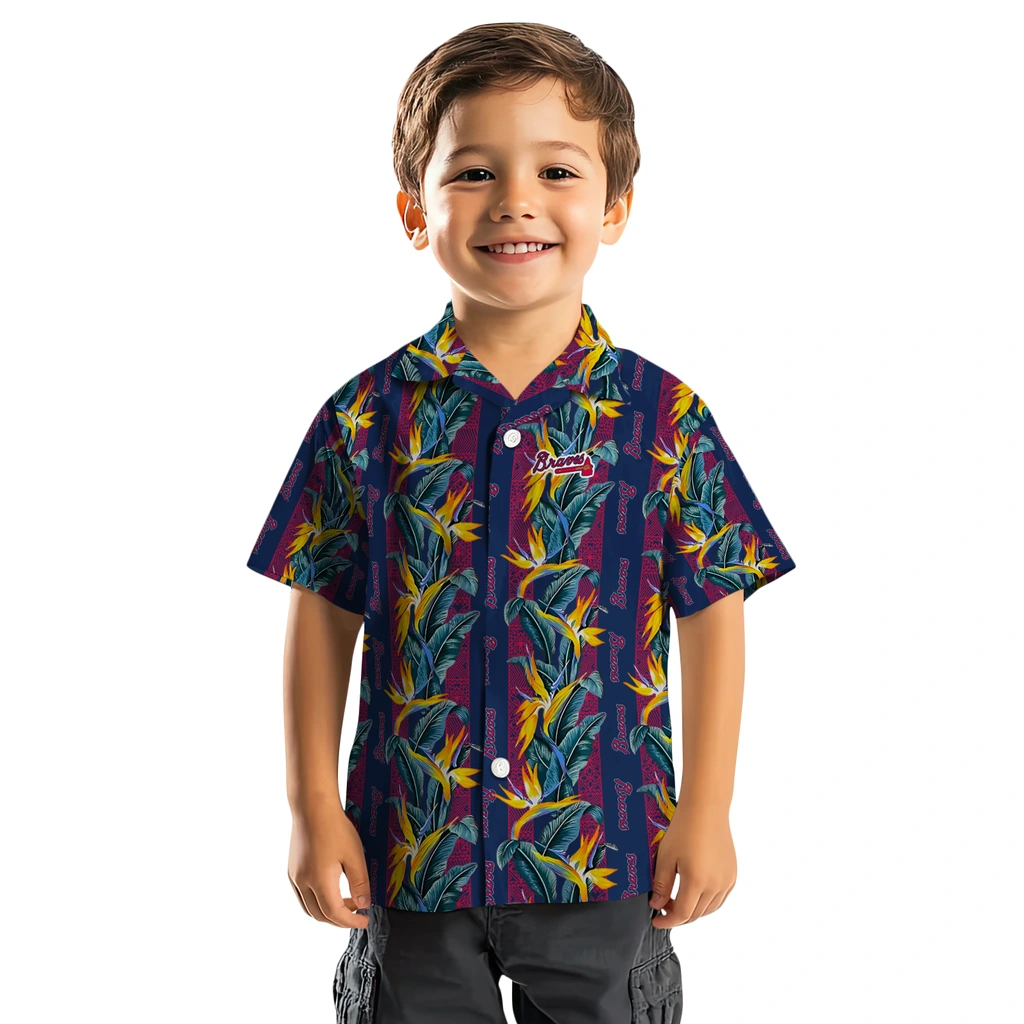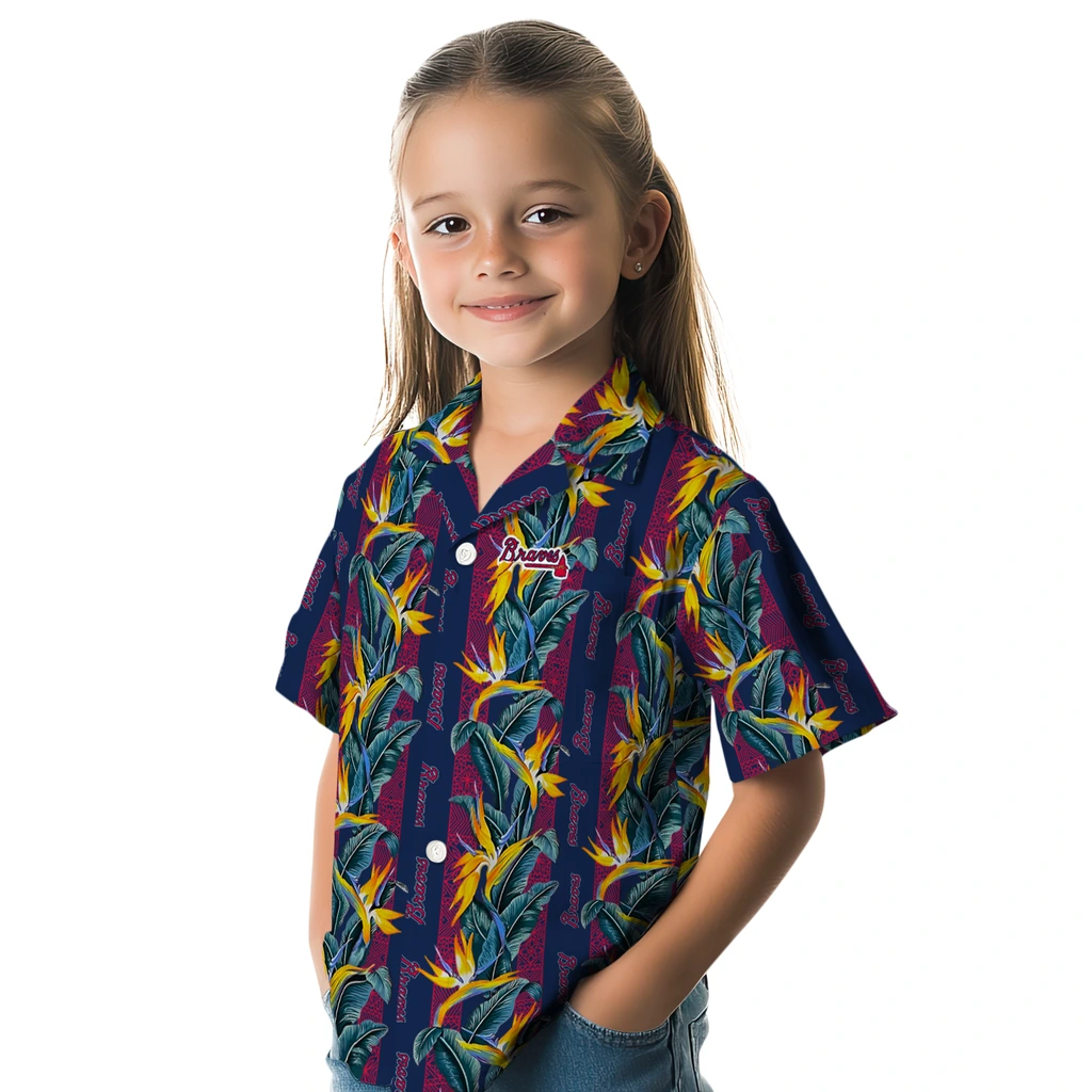 Show your Atlanta Braves spirit in tropical style. Tropical paradise with Bird of Paradise flowers, tropical leaves, and team logo. Available for men, women and kids. Great for matching looks.