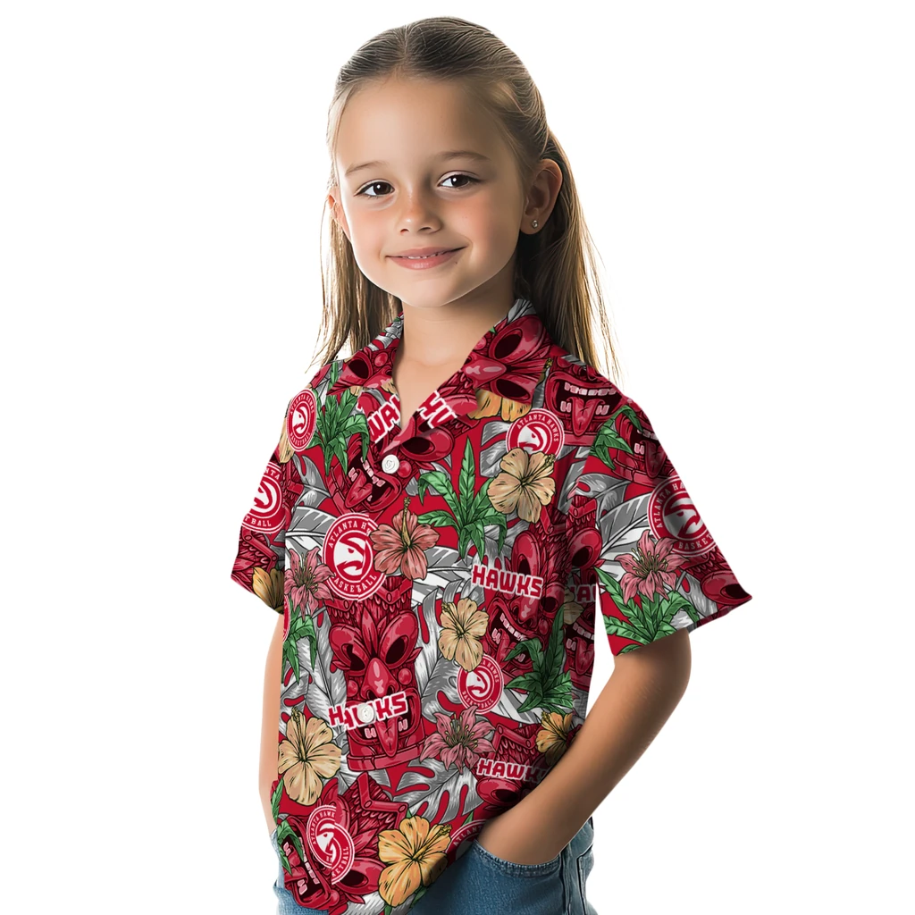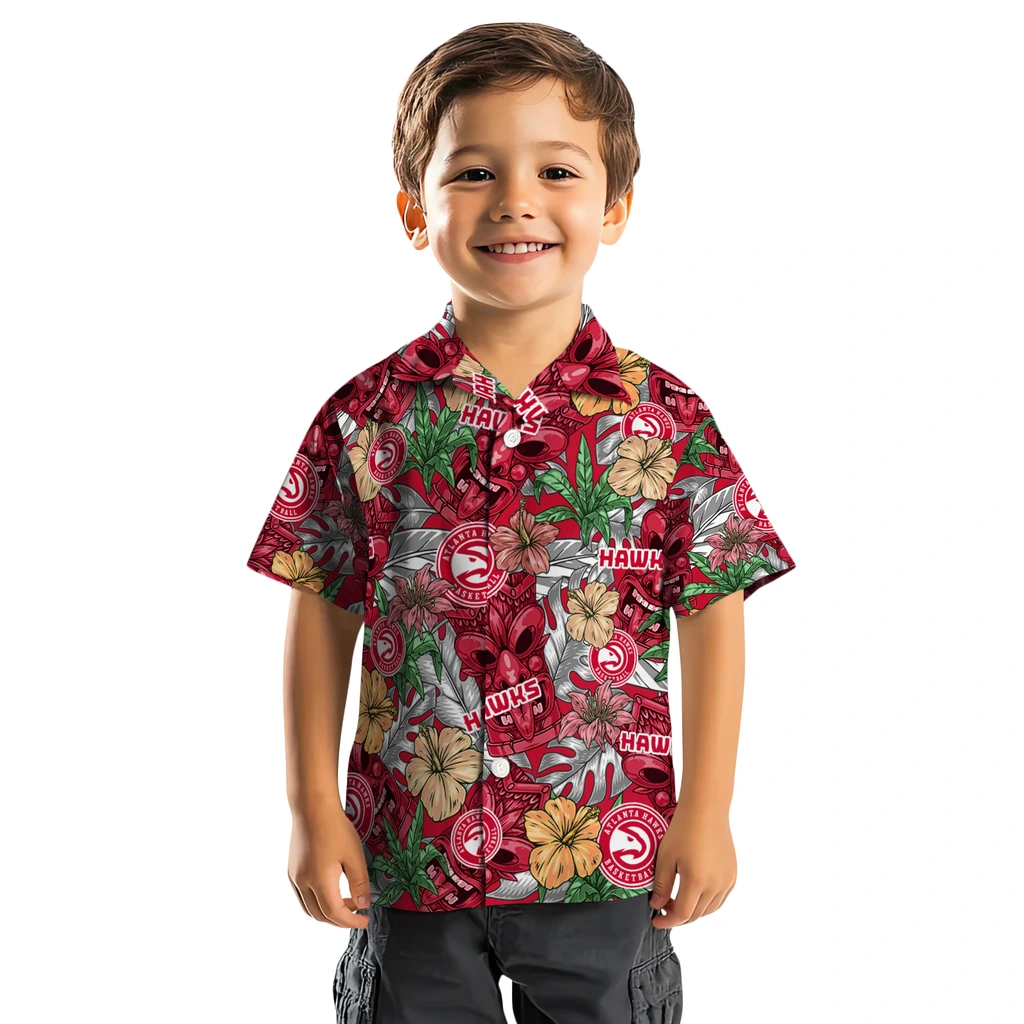 Show your Atlanta Hawks spirit in tropical style. Hibiscus tiki jungle design with tropical leaves, jungle, beach, and team logo for a bold style. Available for men, women and kids. Great for matching looks.
