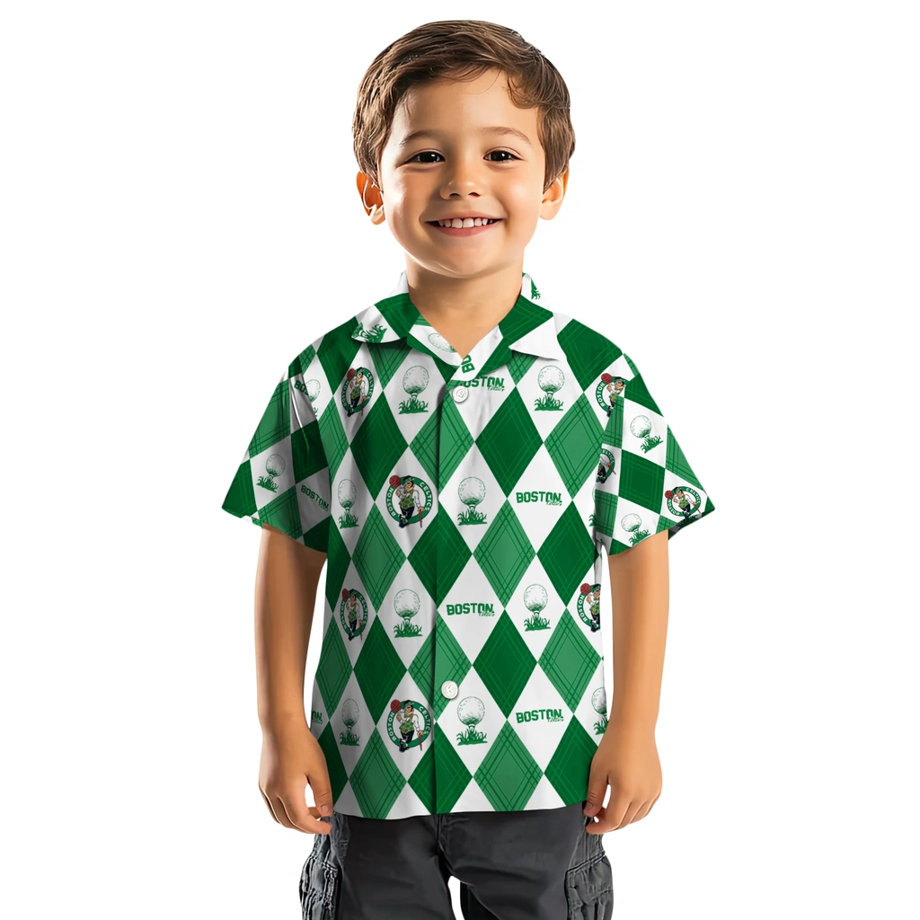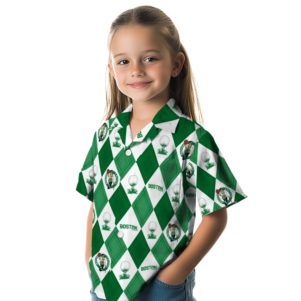 Show your Boston Celtics spirit in tropical style. Golf ball and plaid pattern highlighted by team logo for a sporty tropical style. Available for men, women and kids. Great for matching looks.