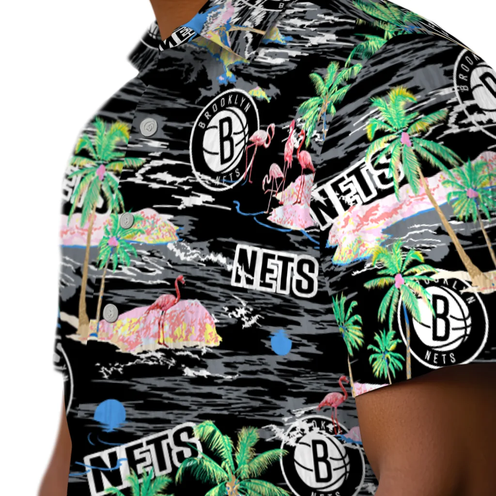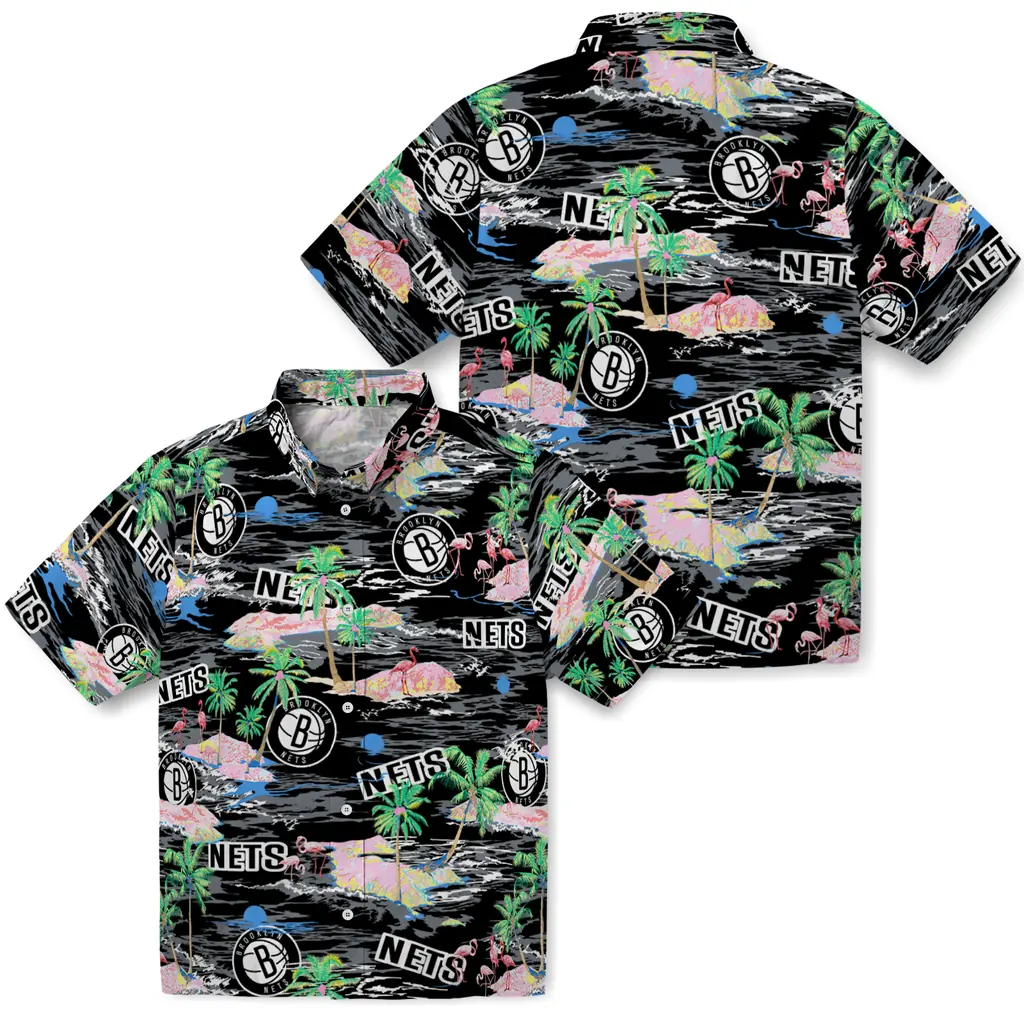 Show your Brooklyn Nets spirit in tropical style. Beach island scenes with flamingos and team logo for a summer-ready Hawaiian shirt. Available for men, women and kids. Great for matching looks.