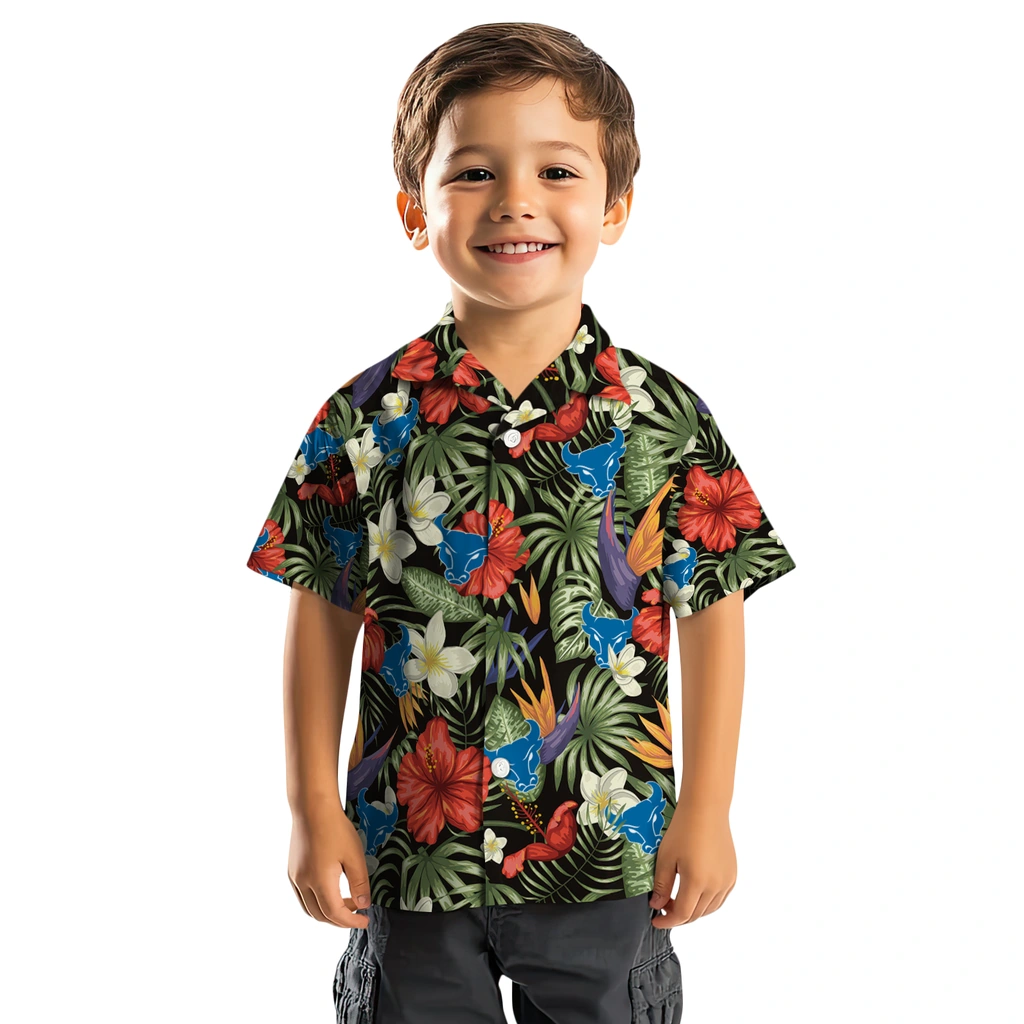 Show your Buffalo Bulls spirit in tropical style. Hibiscus, plumeria, and tropical foliage combined with team logo for a layered tropical design. Available for men, women and kids. Great for matching looks.