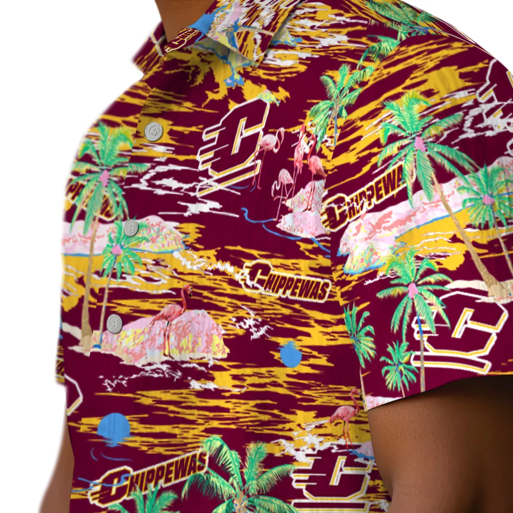 Show your Central Michigan Chippewas spirit in tropical style. Beach island scenes with flamingos and team logo for a summer-ready Hawaiian shirt. Available for men, women and kids. Great for matching looks.