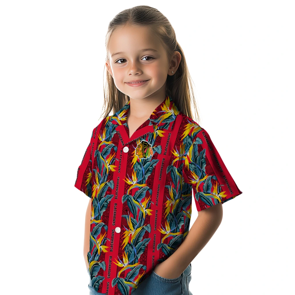 Show your Chicago Blackhawks spirit in tropical style. Tropical paradise with Bird of Paradise flowers, tropical leaves, and team logo. Available for men, women and kids. Great for matching looks.