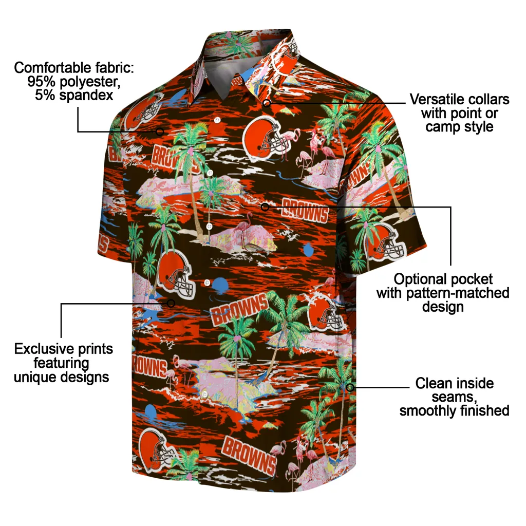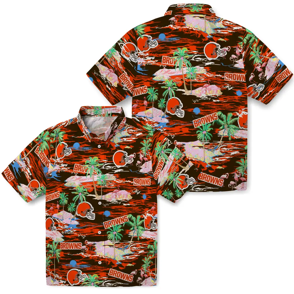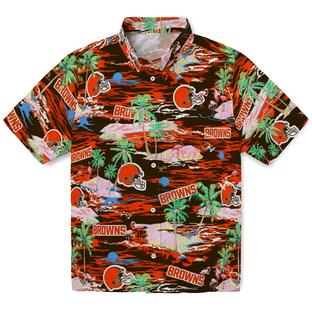 Show your Cleveland Browns spirit in tropical style. Beach island scenes with flamingos and team logo for a summer-ready Hawaiian shirt. Available for men, women and kids. Great for matching looks.