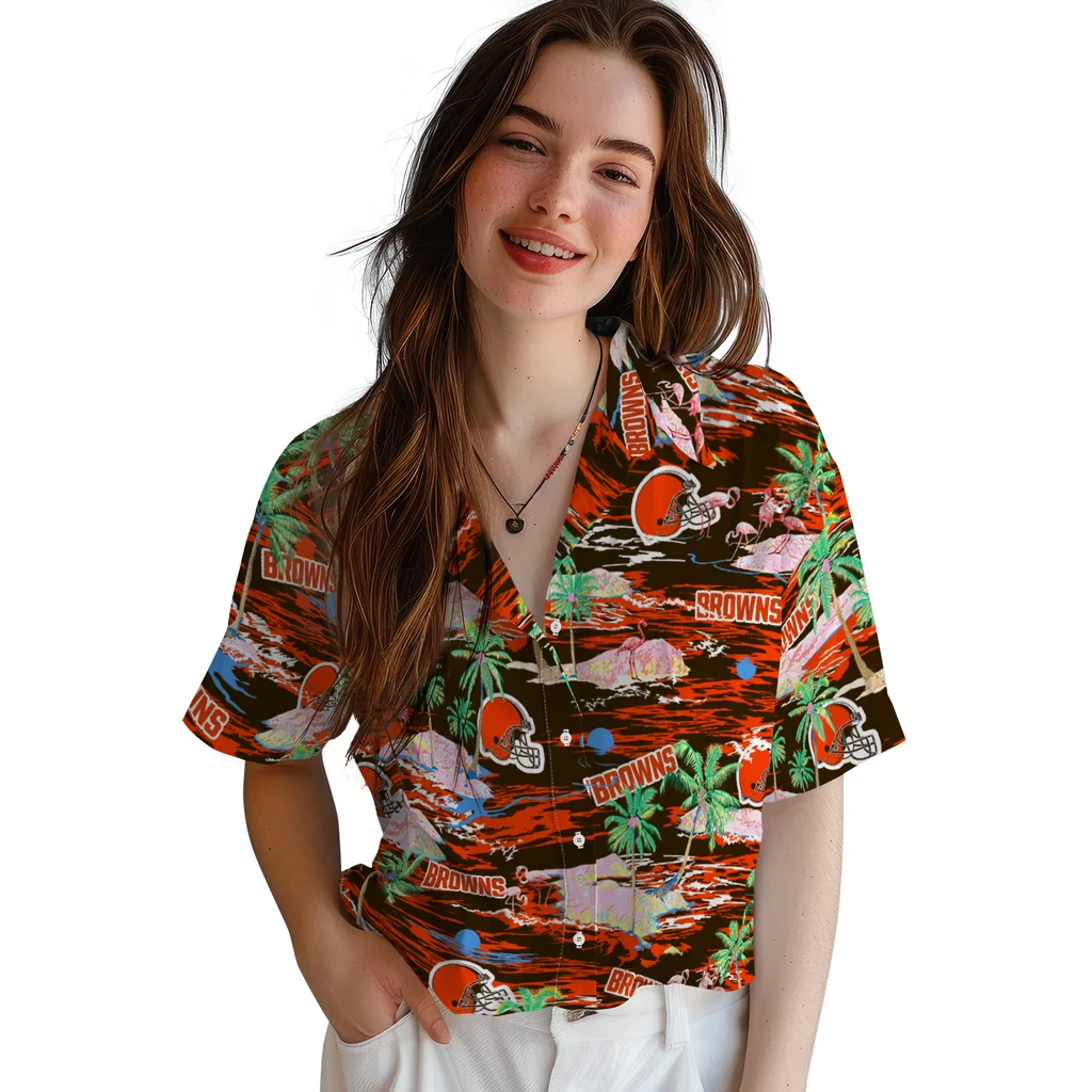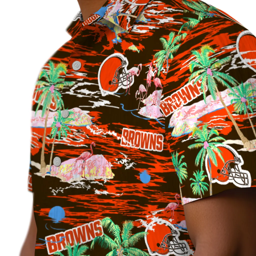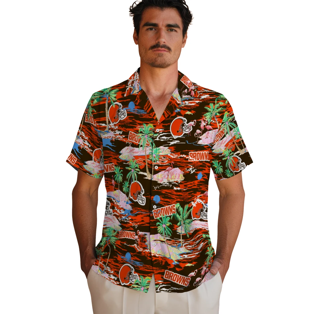 Show your Cleveland Browns spirit in tropical style. Beach island scenes with flamingos and team logo for a summer-ready Hawaiian shirt. Available for men, women and kids. Great for matching looks.