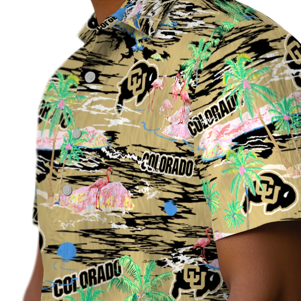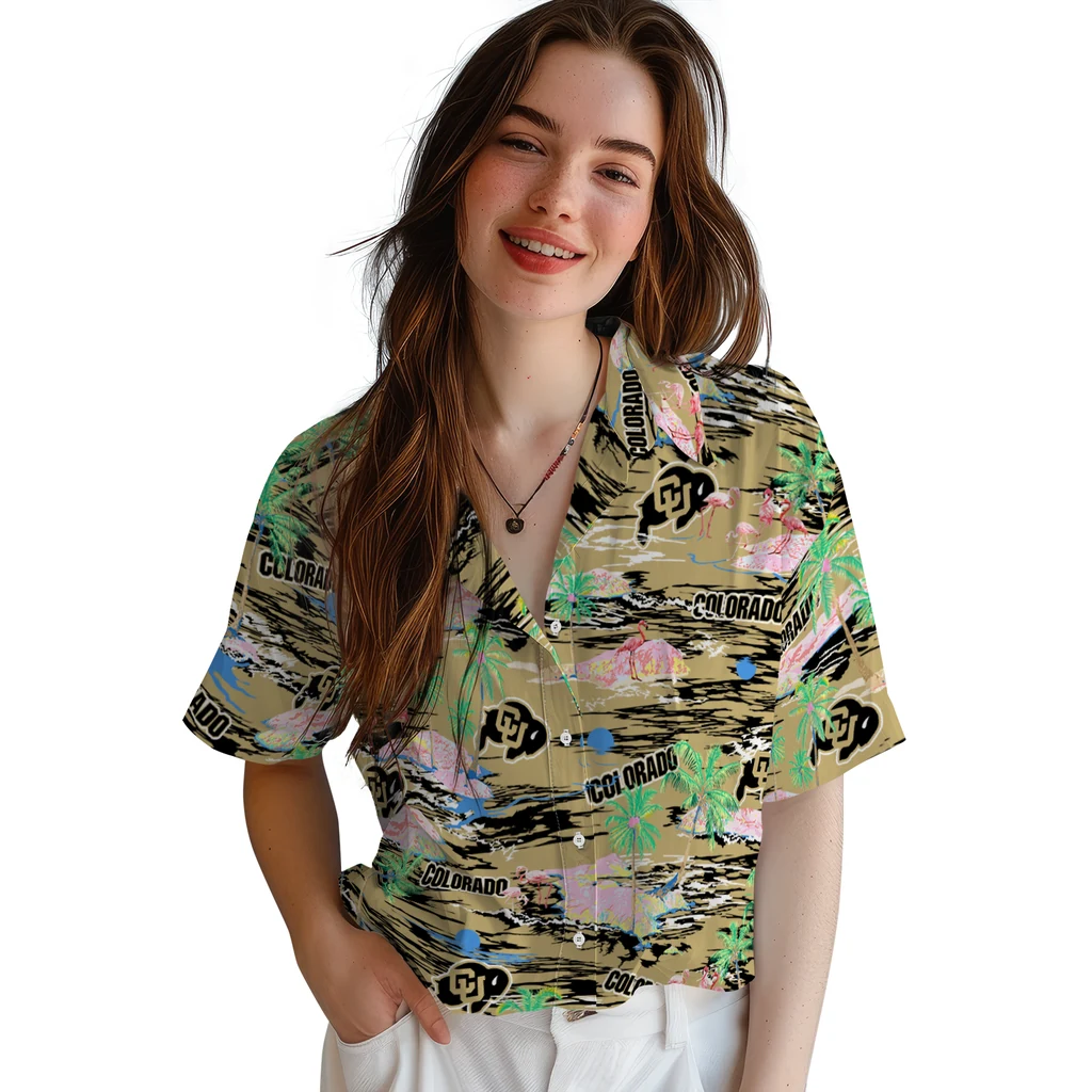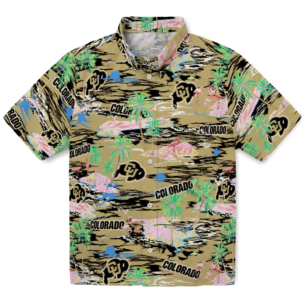 Show your Colorado Buffaloes spirit in tropical style. Beach island scenes with flamingos and team logo for a summer-ready Hawaiian shirt. Available for men, women and kids. Great for matching looks.