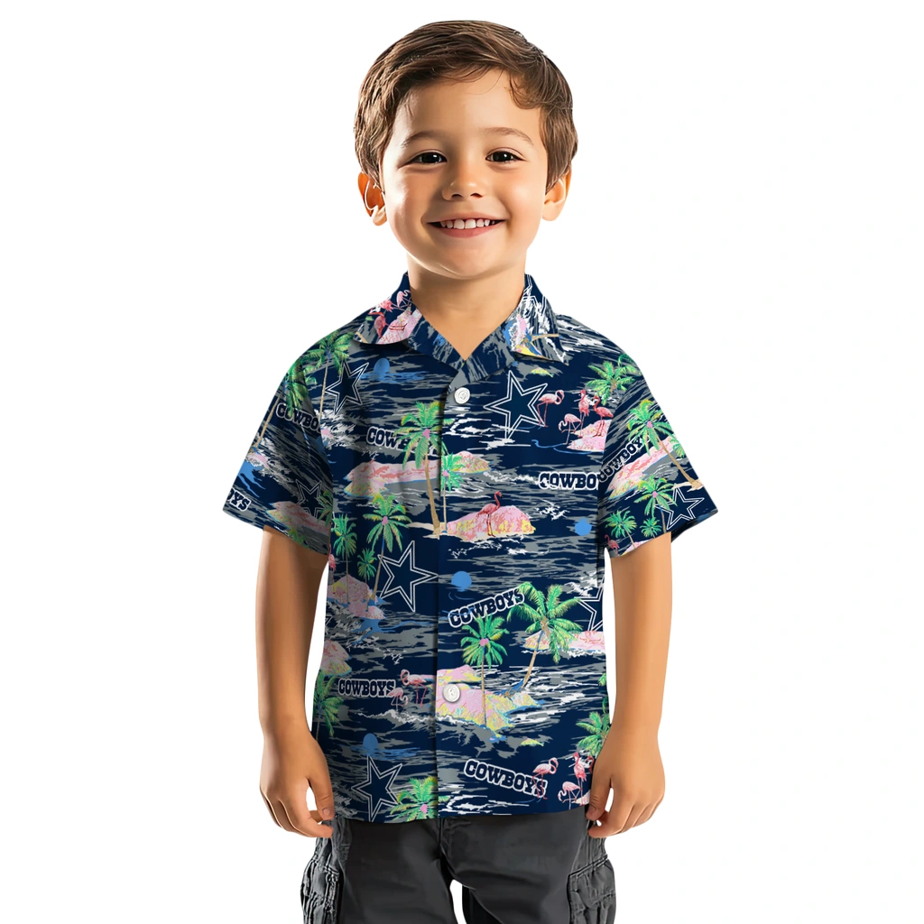 Show your Dallas Cowboys spirit in tropical style. Beach island scenes with flamingos and team logo for a summer-ready Hawaiian shirt. Available for men, women and kids. Great for matching looks.