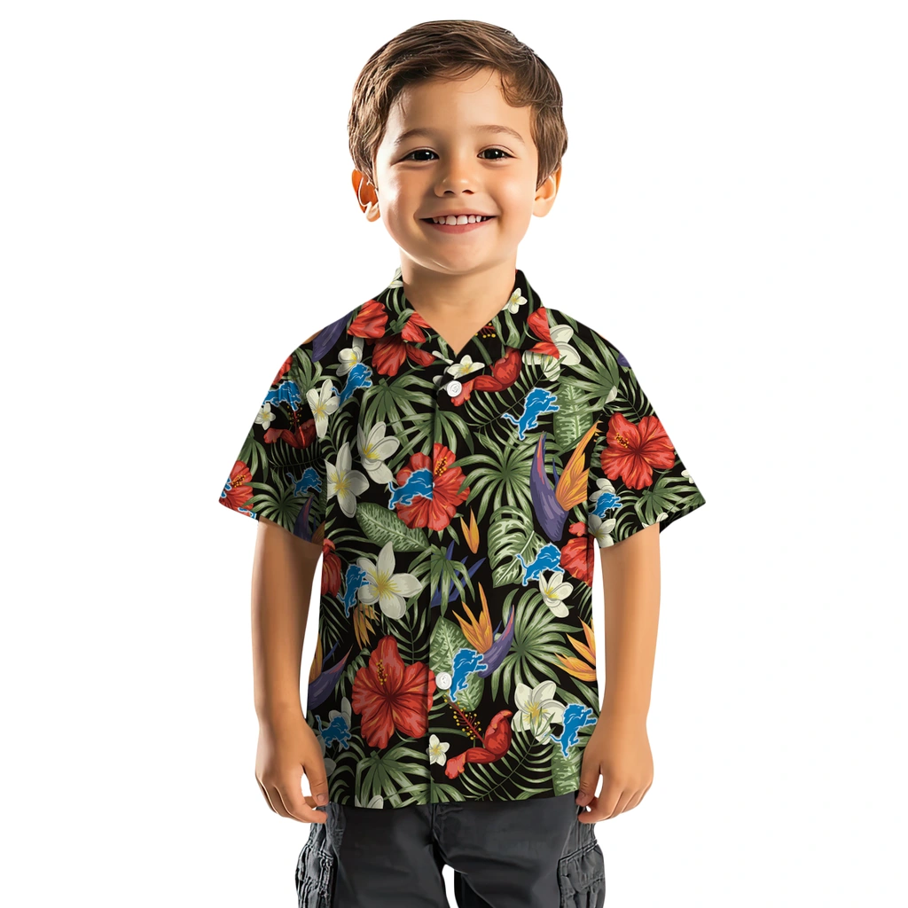 Show your Detroit Lions spirit in tropical style. Hibiscus tropics with tropical leaves, plumeria, and team logo for a vibrant design. Available for men, women and kids. Great for matching looks.