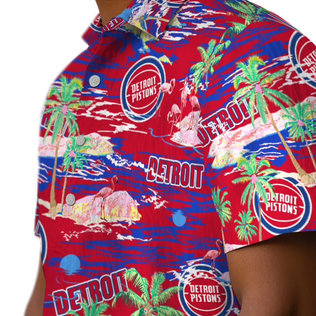 Show your Detroit Pistons spirit in tropical style. Beach island scenes with flamingos and team logo for a summer-ready Hawaiian shirt. Available for men, women and kids. Great for matching looks.