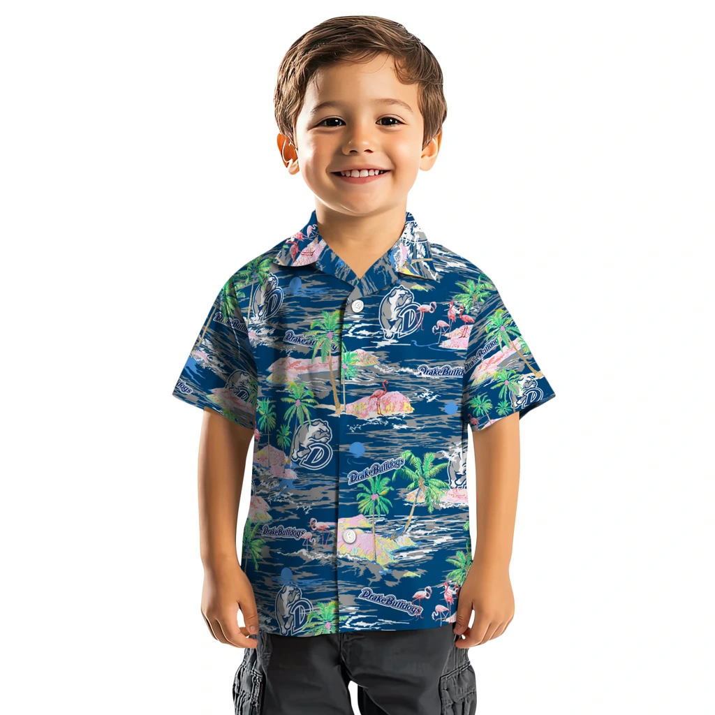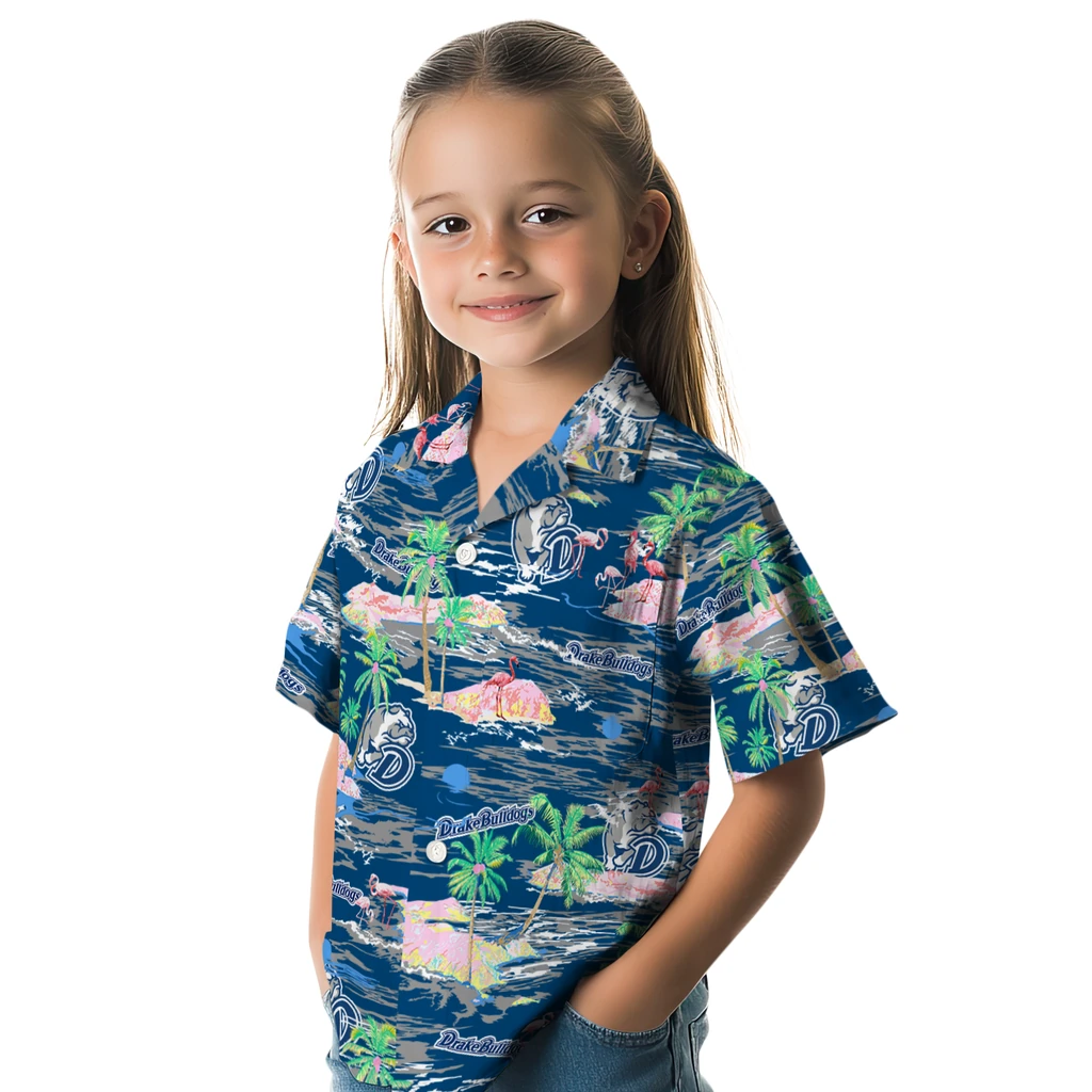 Show your Drake Bulldogs spirit in tropical style. Beach island scenes with flamingos and team logo for a summer-ready Hawaiian shirt. Available for men, women and kids. Great for matching looks.
