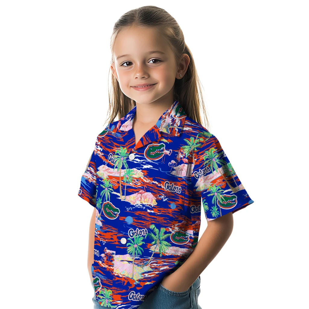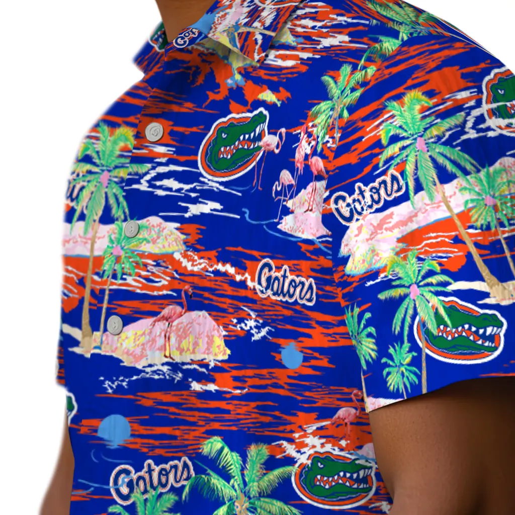 Show your Florida Gators spirit in tropical style. Beach island scenes with flamingos and team logo for a summer-ready Hawaiian shirt. Available for men, women and kids. Great for matching looks.