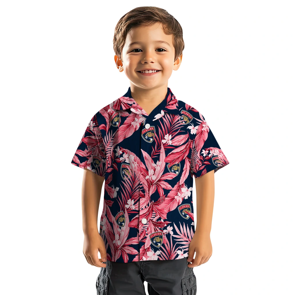 Show your Florida Panthers spirit in tropical style. Red hibiscus flowers scattered with monstera and palm leaves, accented with team logo. Available for men, women and kids. Great for matching looks.