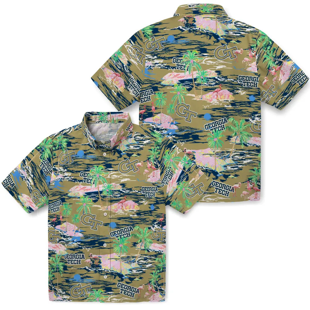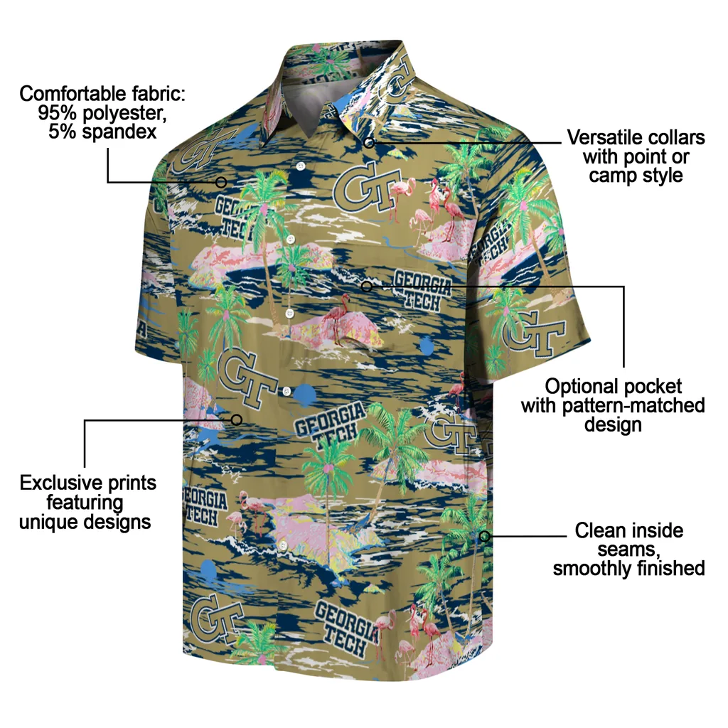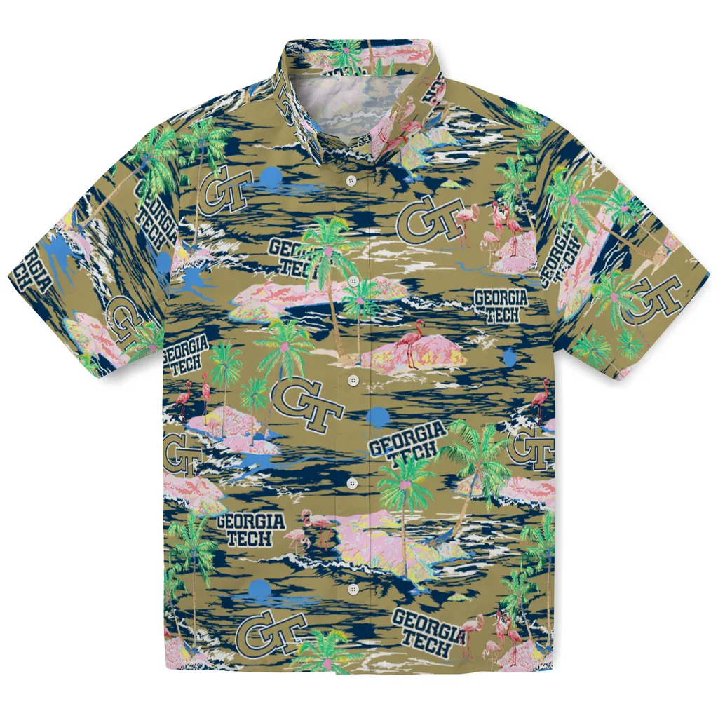 Show your Georgia Tech Yellow Jackets spirit in tropical style. Beach island scenes with flamingos and team logo for a summer-ready Hawaiian shirt. Available for men, women and kids. Great for matching looks.