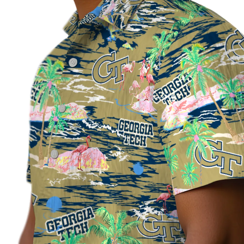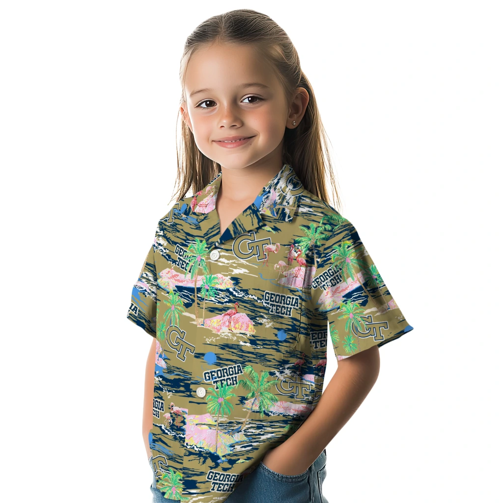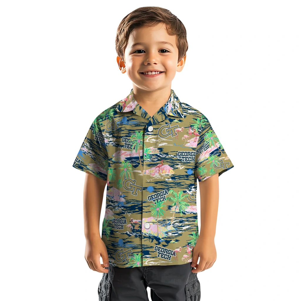 Show your Georgia Tech Yellow Jackets spirit in tropical style. Beach island scenes with flamingos and team logo for a summer-ready Hawaiian shirt. Available for men, women and kids. Great for matching looks.