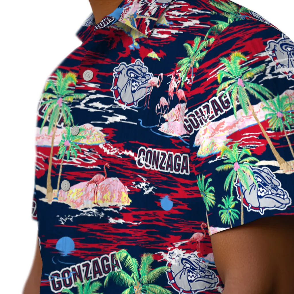 Show your Gonzaga Bulldogs spirit in tropical style. Beach island scenes with flamingos and team logo for a summer-ready Hawaiian shirt. Available for men, women and kids. Great for matching looks.