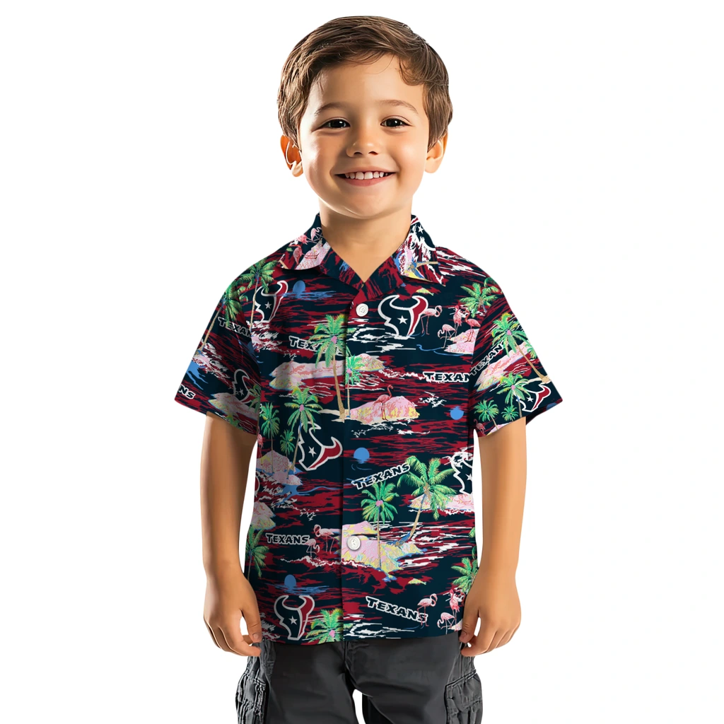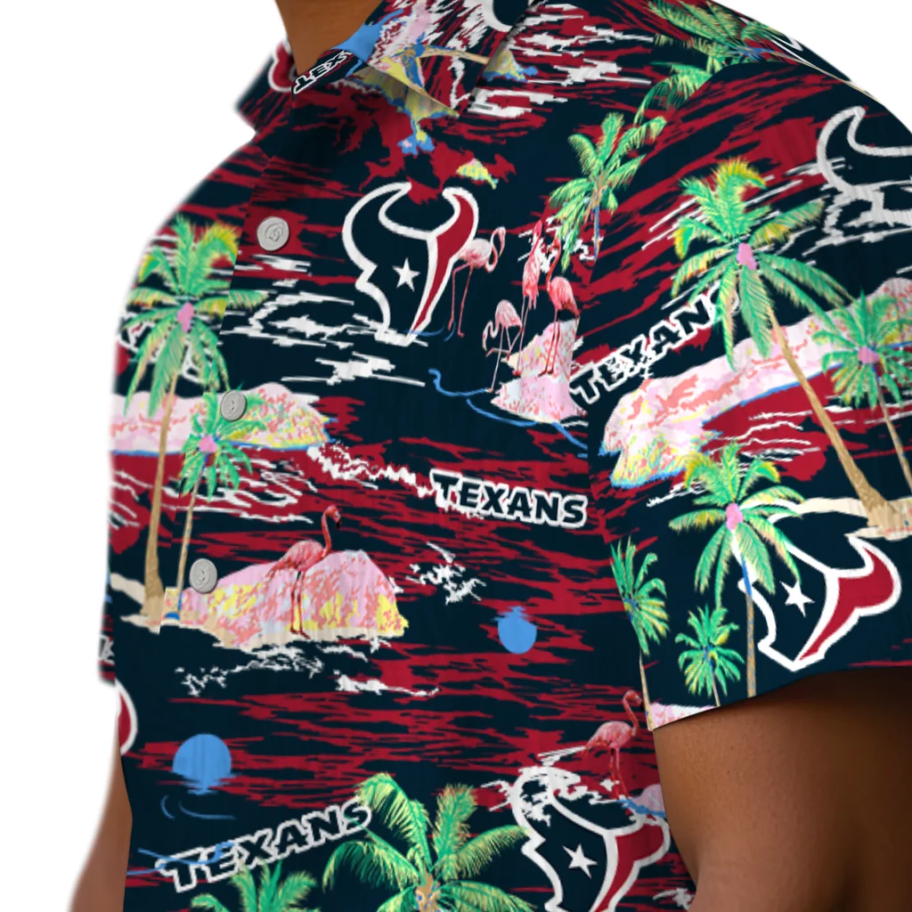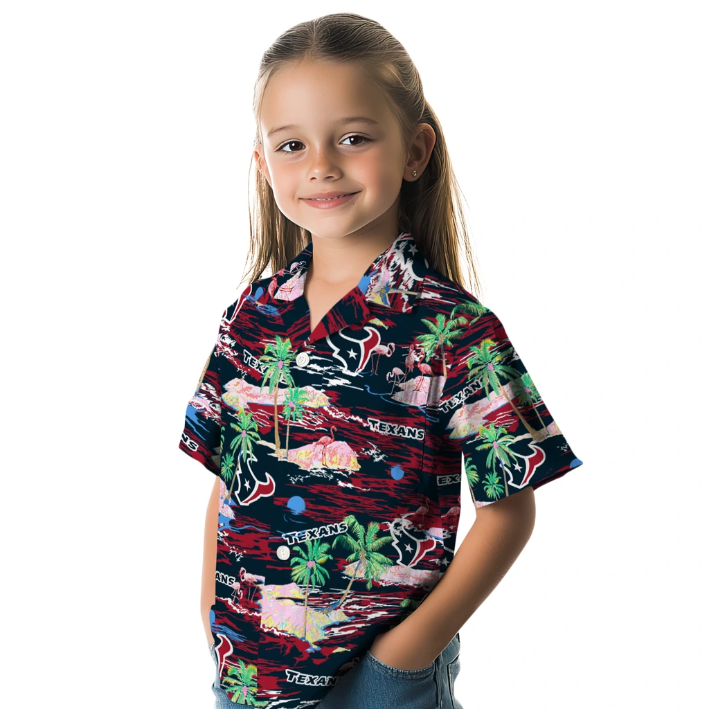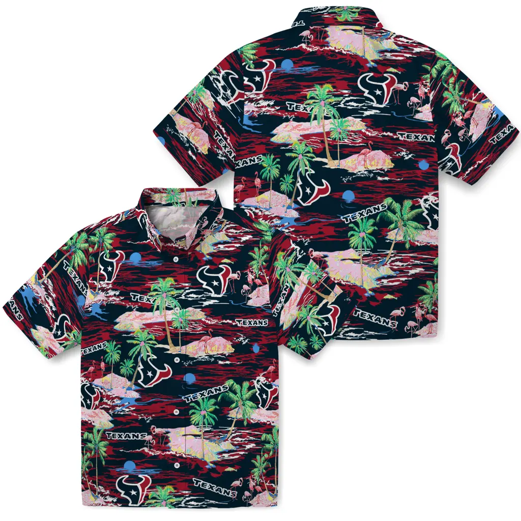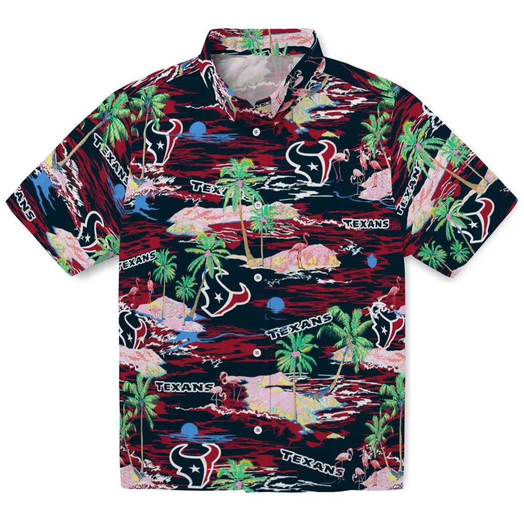 Show your Houston Texans spirit in tropical style. Beach island scenes with flamingos and team logo for a summer-ready Hawaiian shirt. Available for men, women and kids. Great for matching looks.