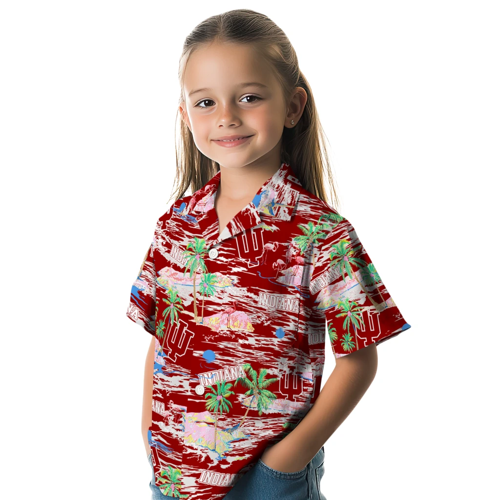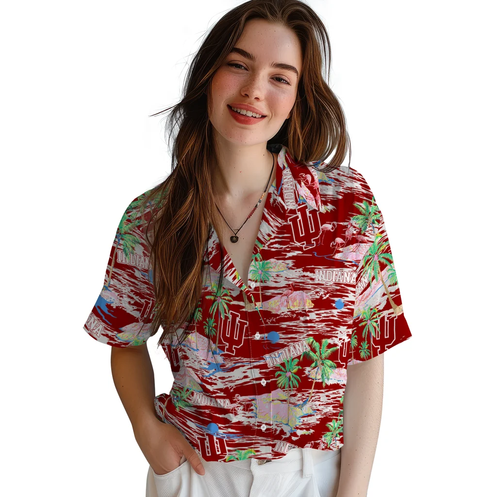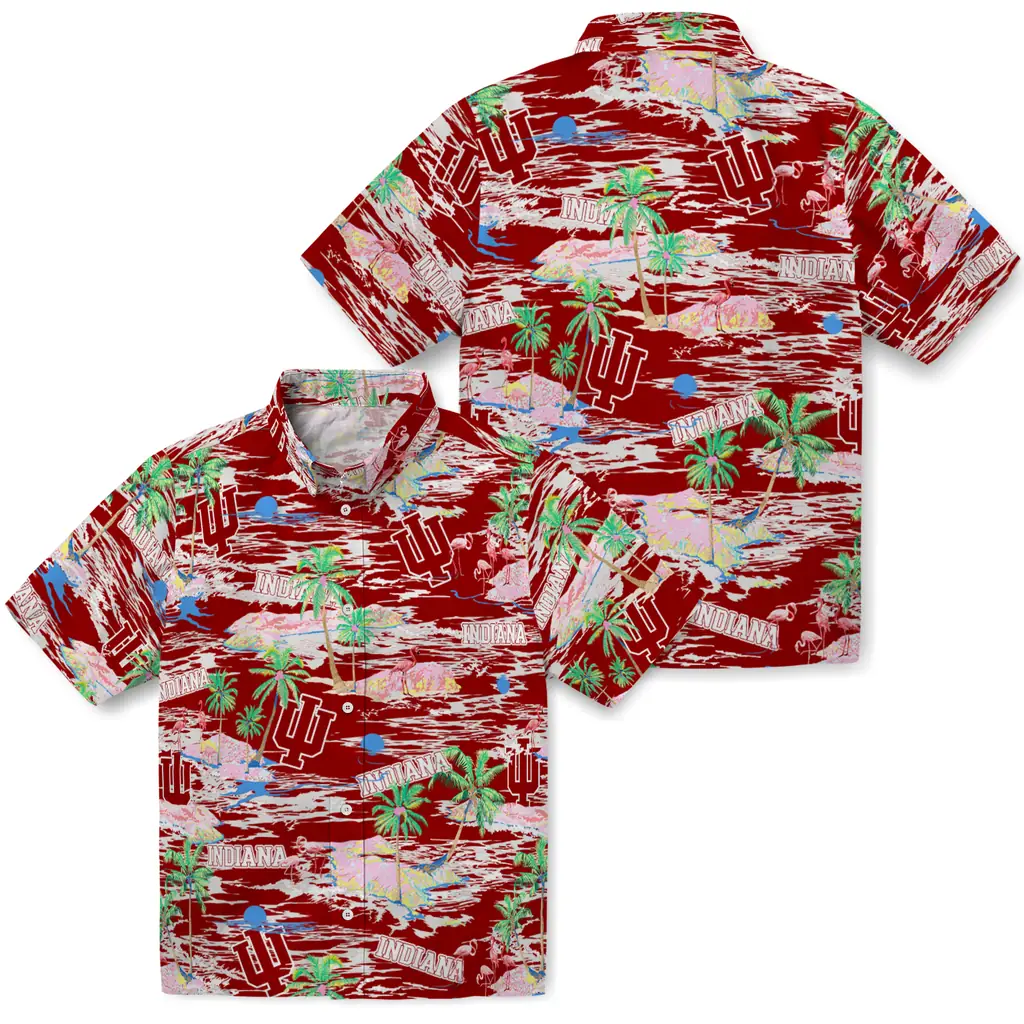 Show your Indiana Hoosiers spirit in tropical style. Beach island scenes with flamingos and team logo for a summer-ready Hawaiian shirt. Available for men, women and kids. Great for matching looks.