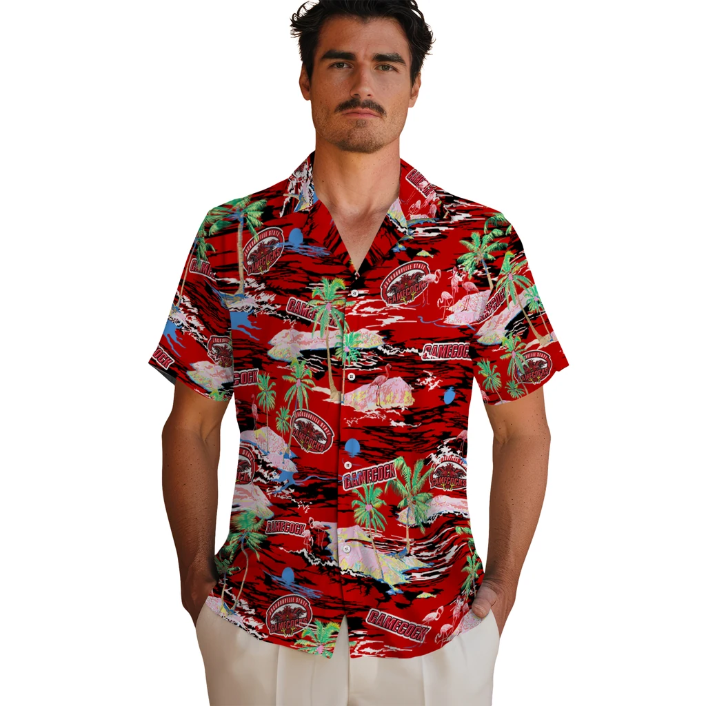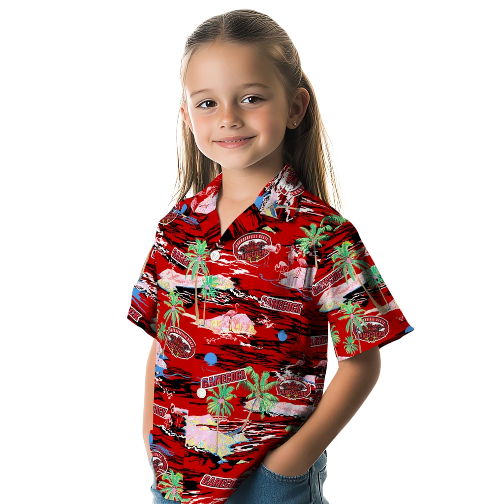Show your Jacksonville State Gamecocks spirit in tropical style. Beach island scenes with flamingos and team logo for a summer-ready Hawaiian shirt. Available for men, women and kids. Great for matching looks.