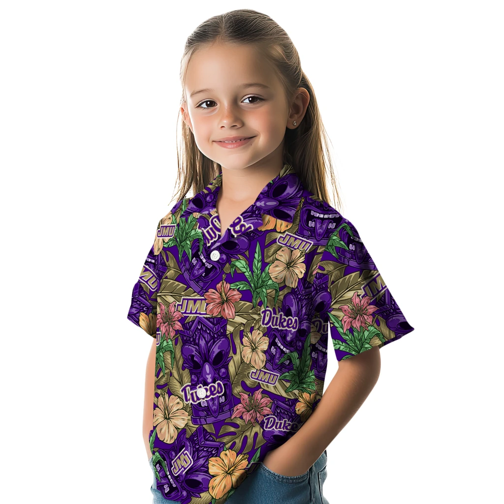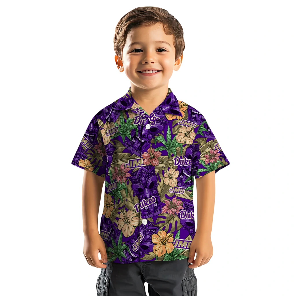 Show your James Madison Dukes spirit in tropical style. Hibiscus tiki jungle design with tropical leaves, jungle, beach, and team logo for a bold style. Available for men, women and kids. Great for matching looks.