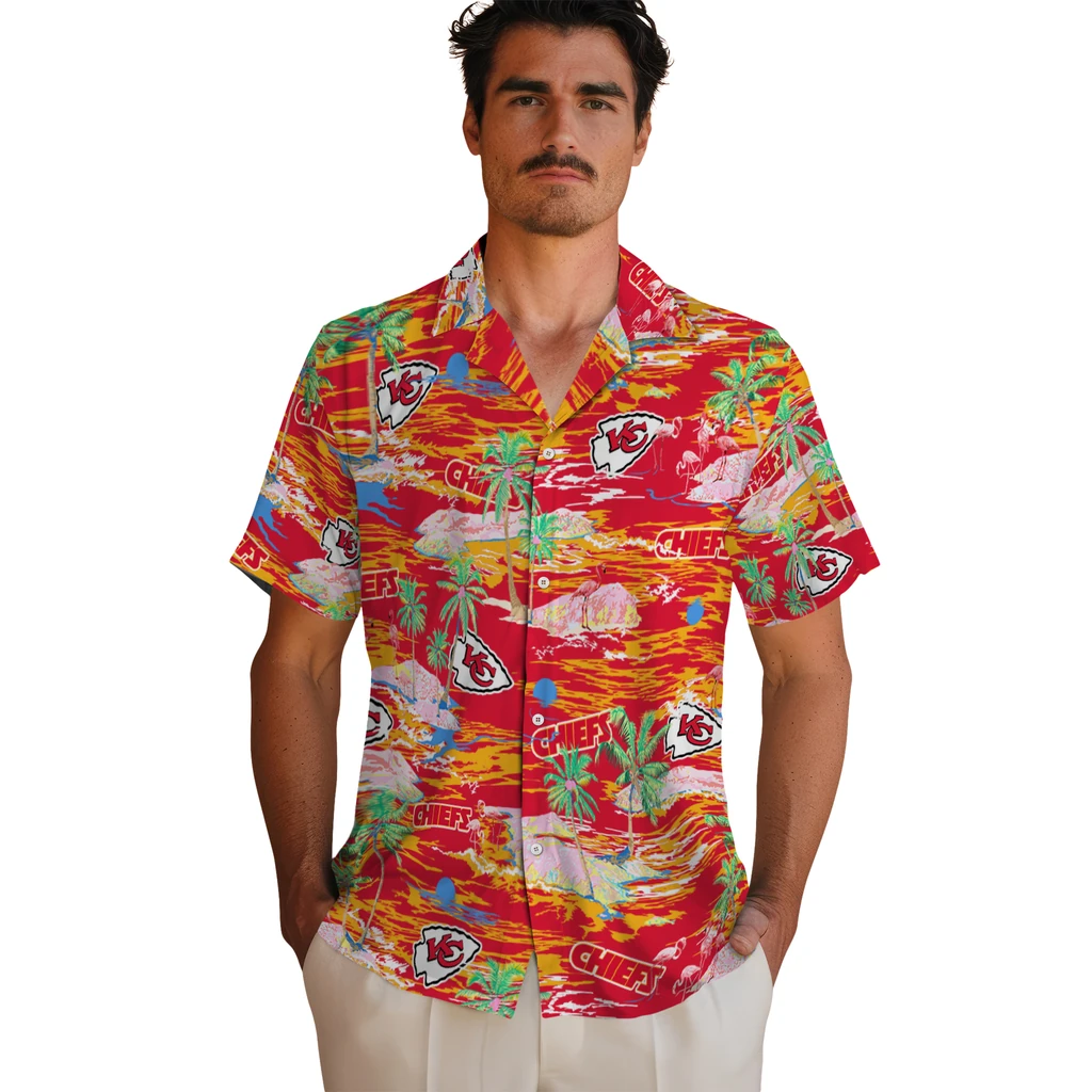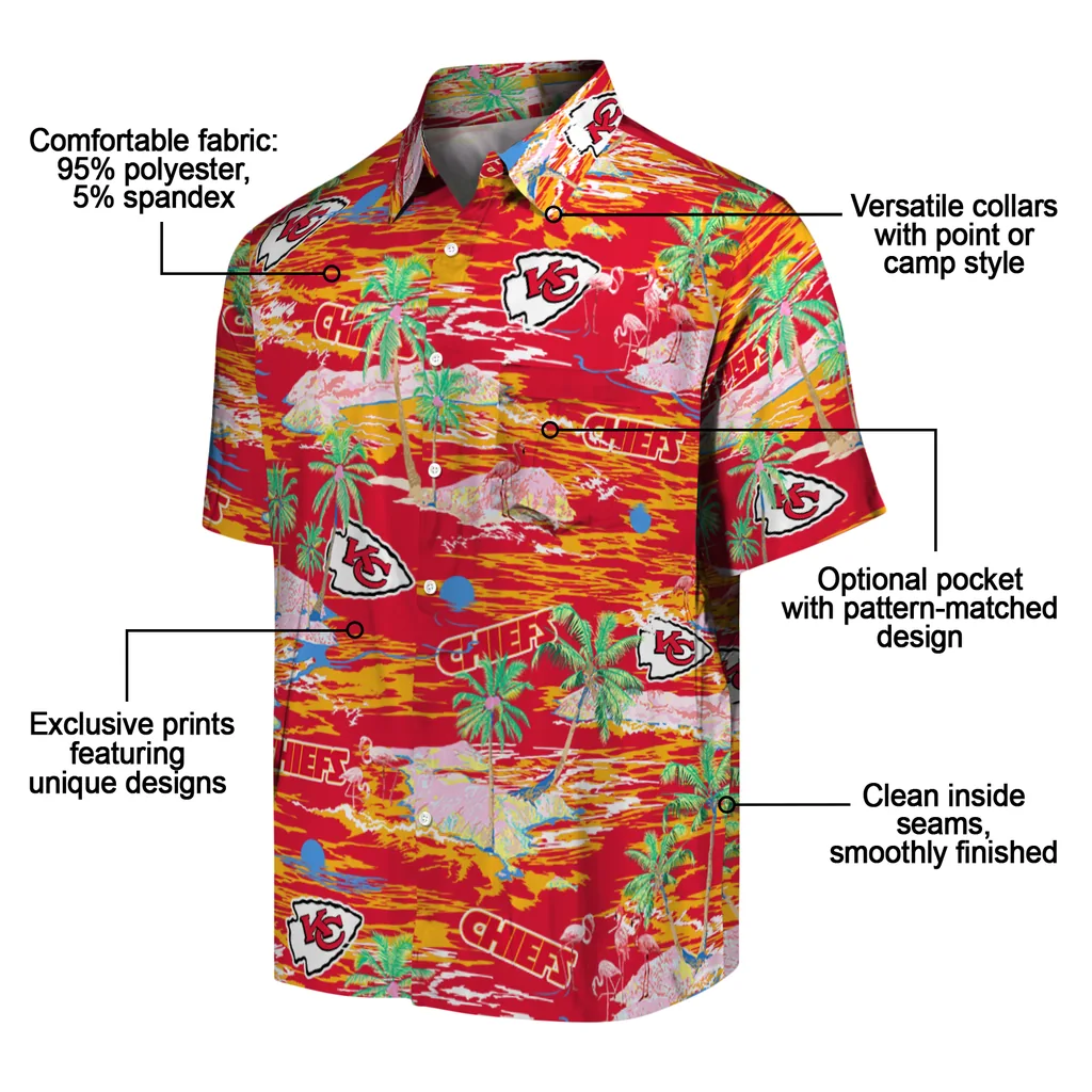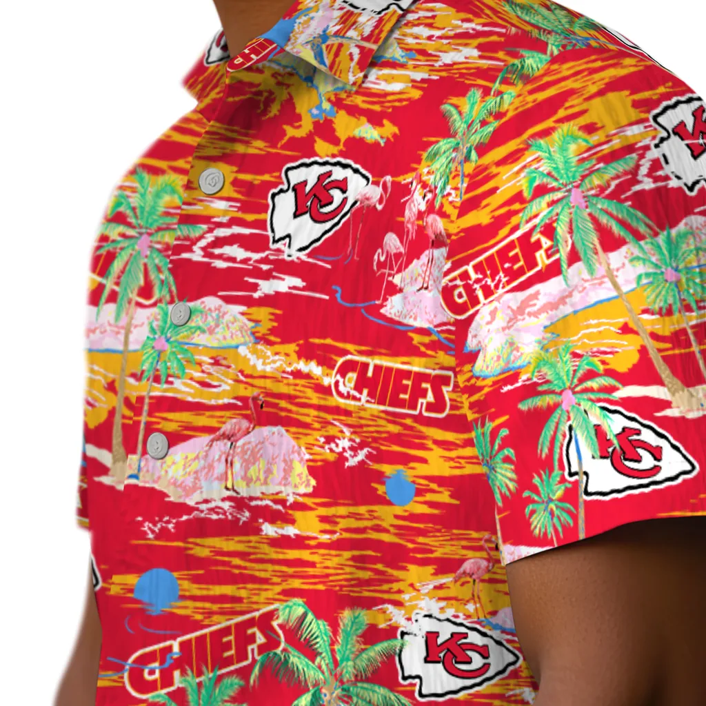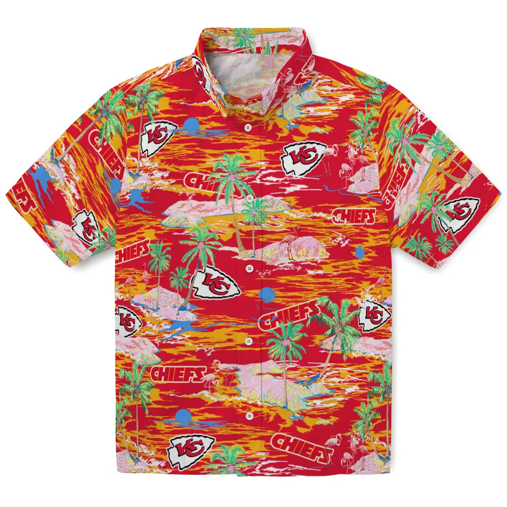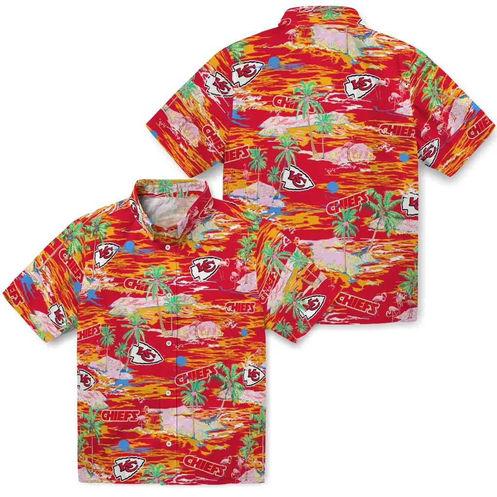 Show your Kansas City Chiefs spirit in tropical style. Beach island scenes with flamingos and team logo for a summer-ready Hawaiian shirt. Available for men, women and kids. Great for matching looks.