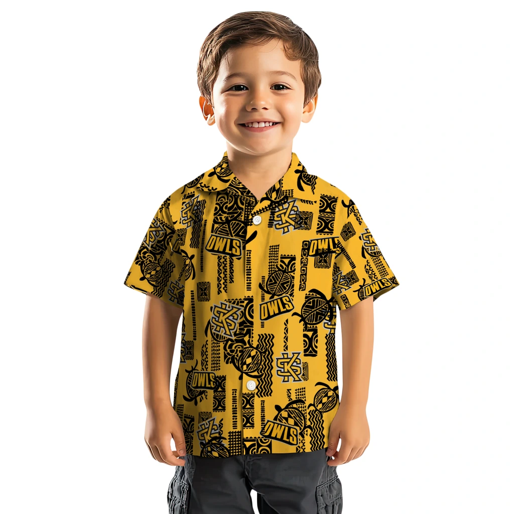 Show your Kennesaw State Owls spirit in tropical style. Abstract turtle artwork accented with team logo for a unique tropical Hawaiian look. Available for men, women and kids. Great for matching looks.