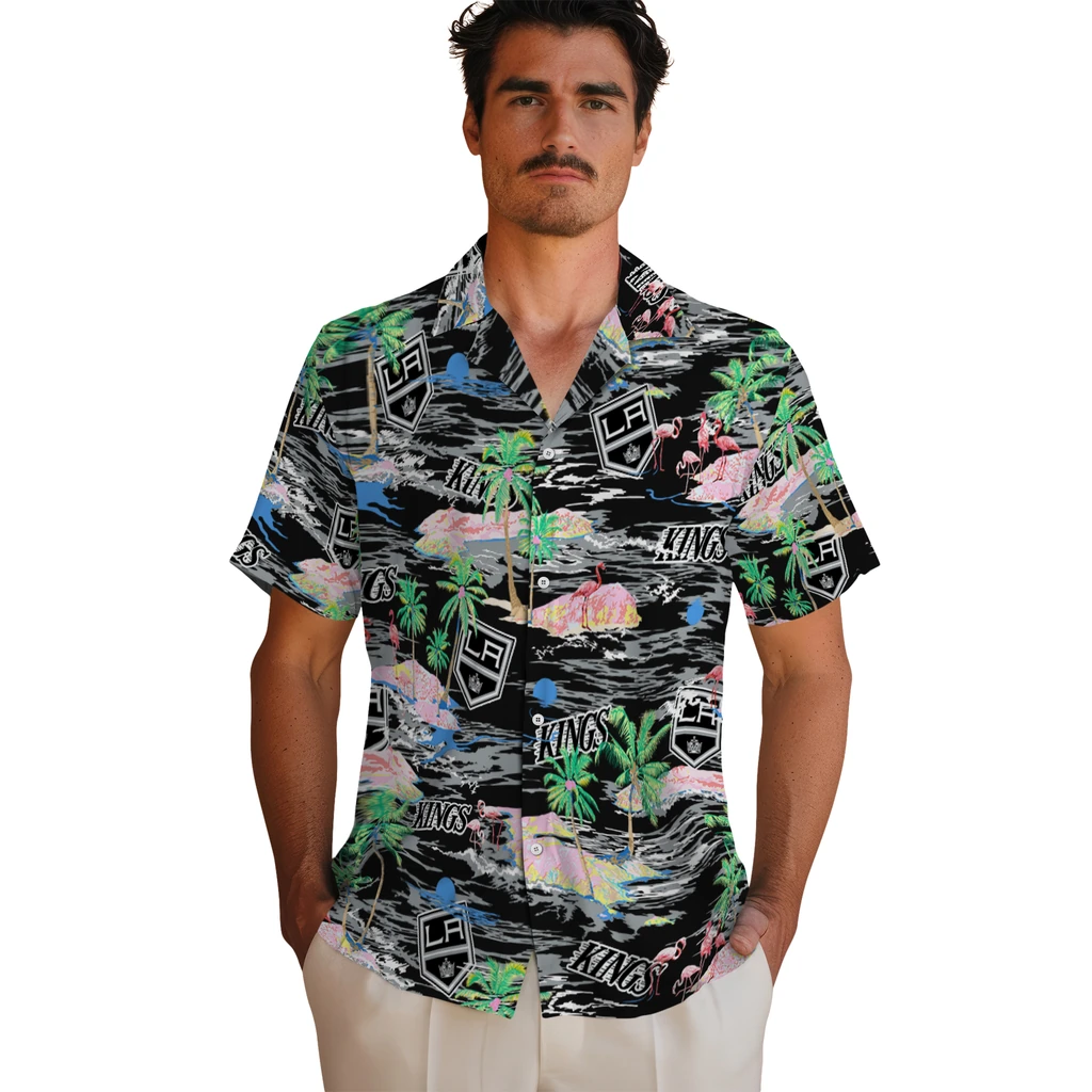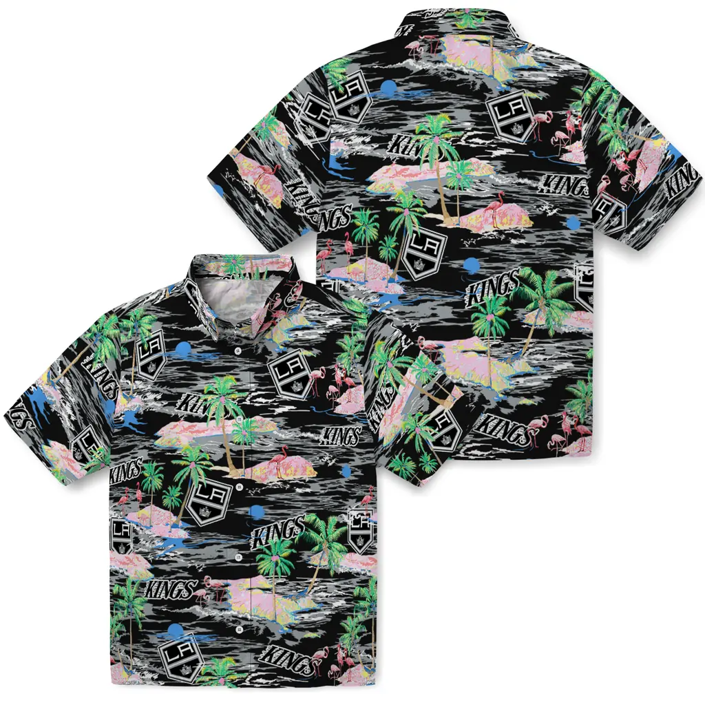 Show your Los Angeles Kings spirit in tropical style. Beach island scenes with flamingos and team logo for a summer-ready Hawaiian shirt. Available for men, women and kids. Great for matching looks.