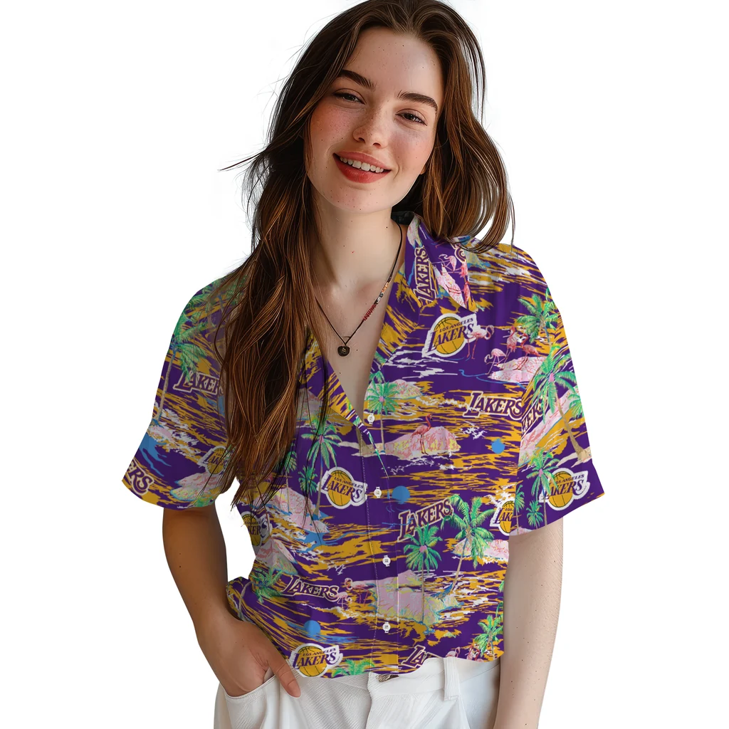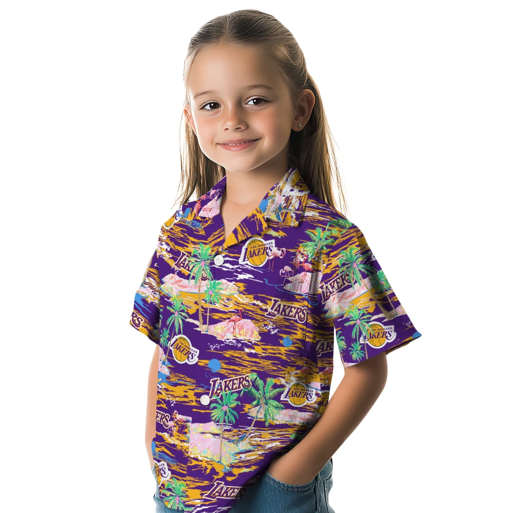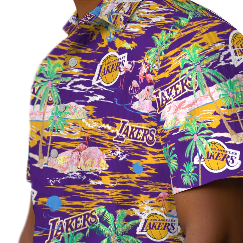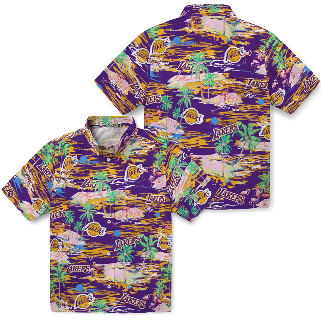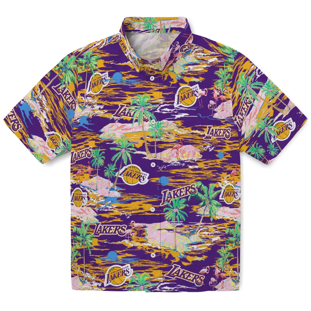 Show your Los Angeles Lakers spirit in tropical style. Beach island scenes with flamingos and team logo for a summer-ready Hawaiian shirt. Available for men, women and kids. Great for matching looks.