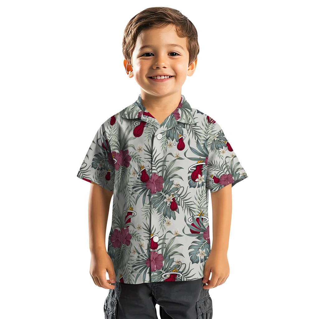 Show your Miami Heat spirit in tropical style. Hibiscus tropics with tropical leaves, plumeria, and team logo for a vibrant design. Available for men, women and kids. Great for matching looks.