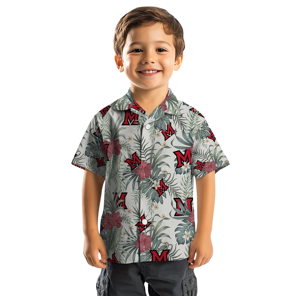 Show your Miami RedHawks spirit in tropical style. Hibiscus and monstera pattern accented with team logo for a vibrant tropical shirt. Available for men, women and kids. Great for matching looks.