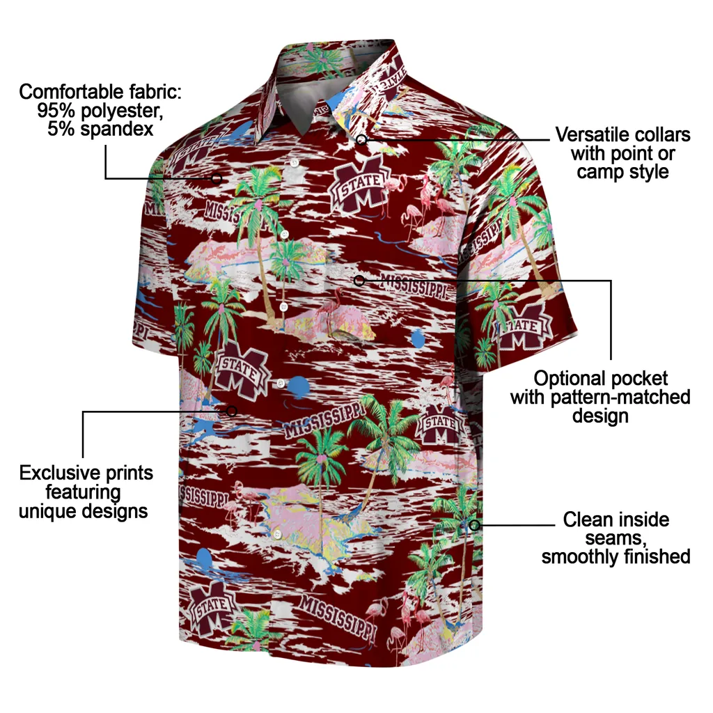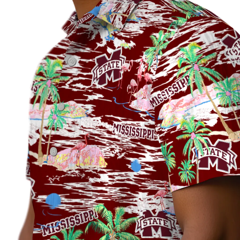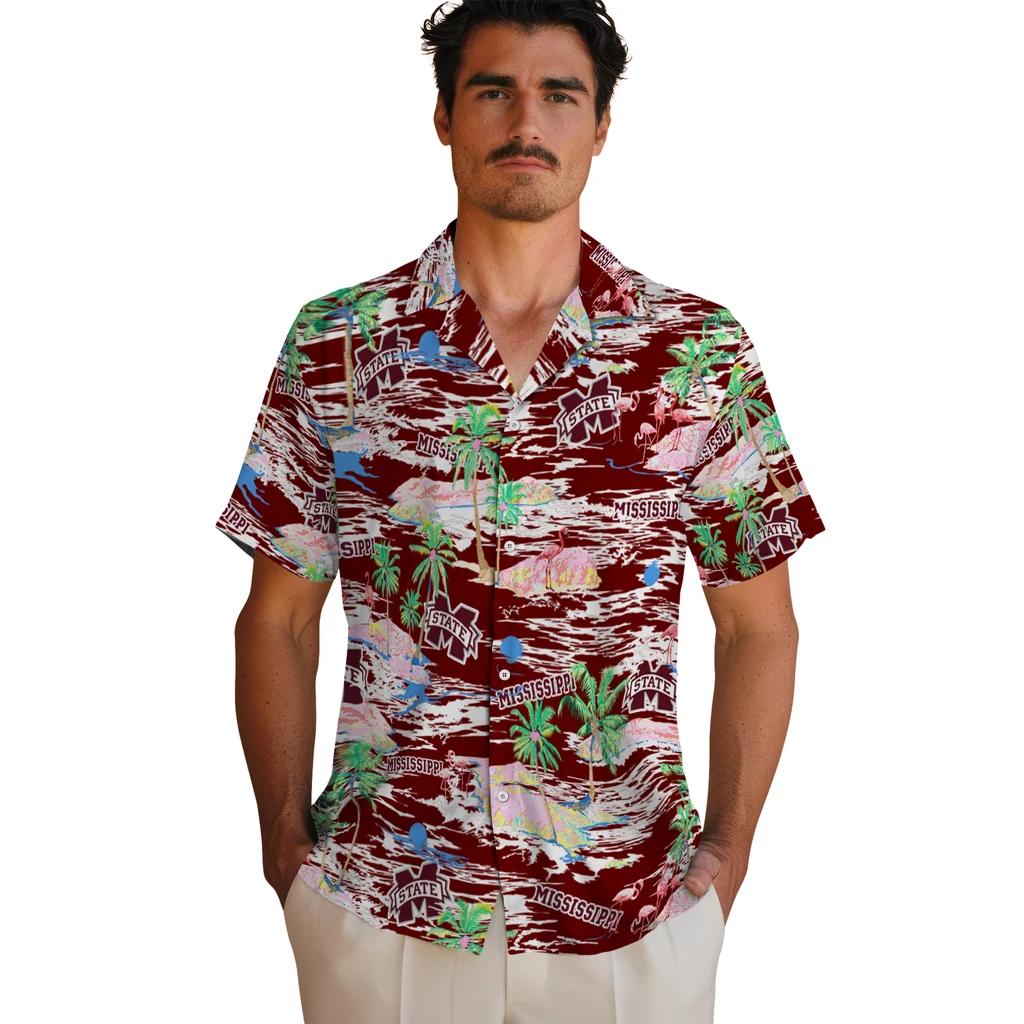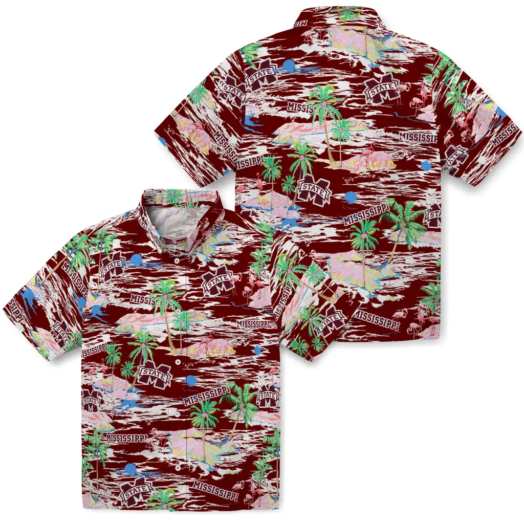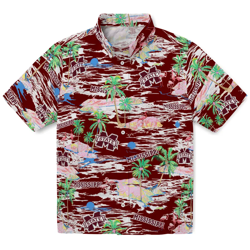 Show your Mississippi State Bulldogs spirit in tropical style. Beach island scenes with flamingos and team logo for a summer-ready Hawaiian shirt. Available for men, women and kids. Great for matching looks.