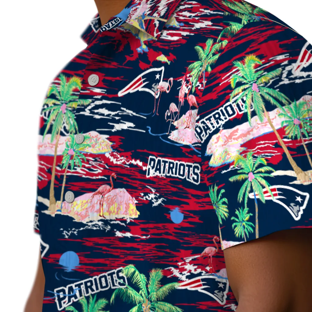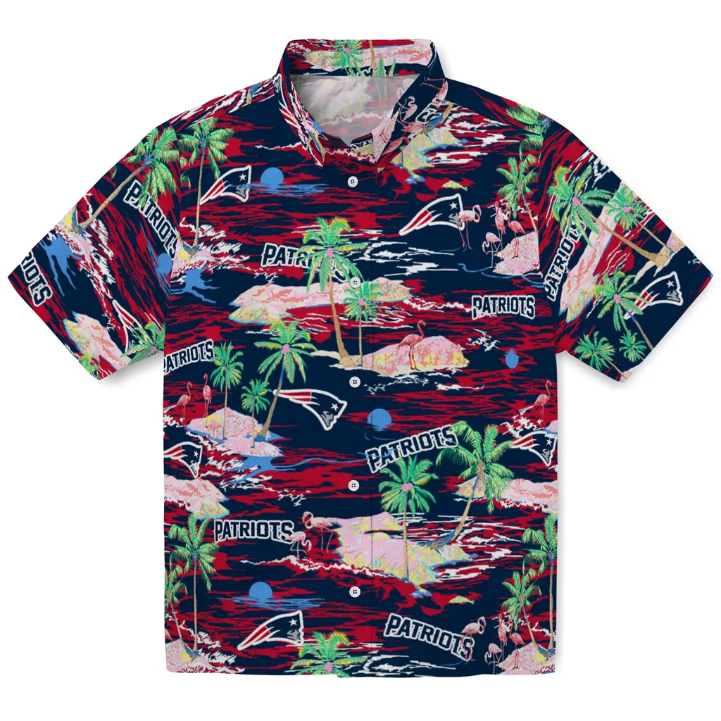 Show your New England Patriots spirit in tropical style. Beach island scenes with flamingos and team logo for a summer-ready Hawaiian shirt. Available for men, women and kids. Great for matching looks.