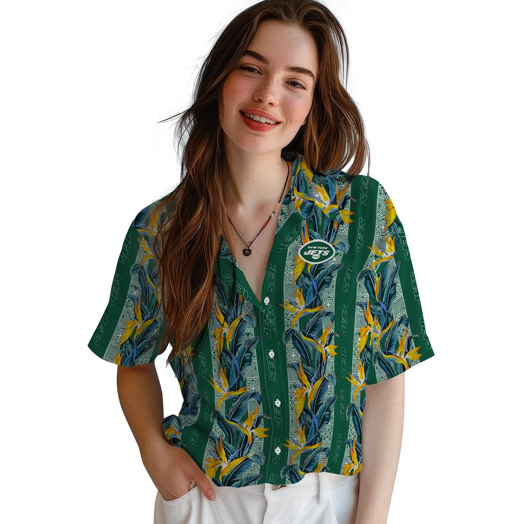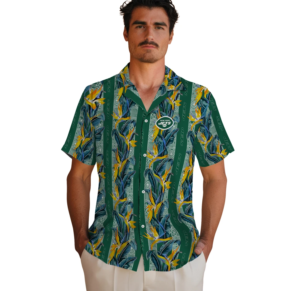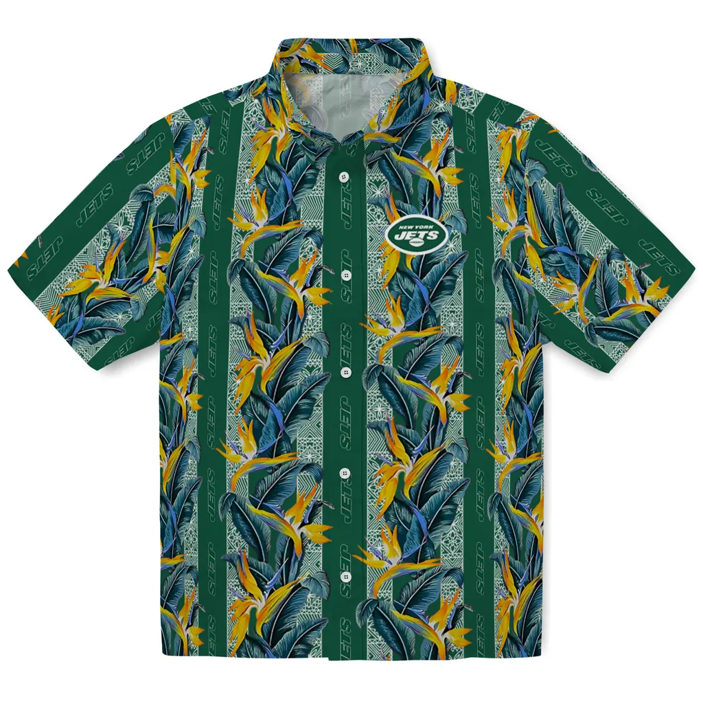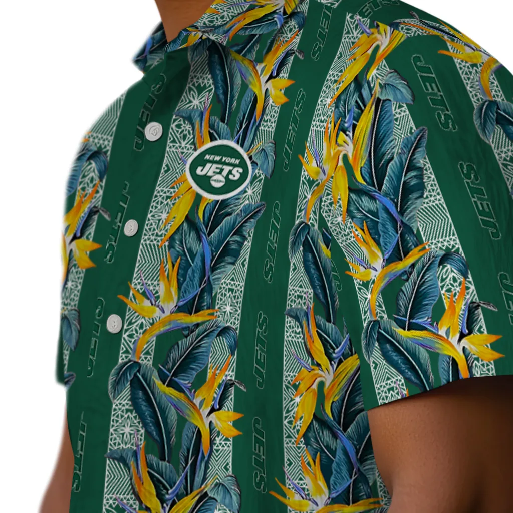 Show your New York Jets spirit in tropical style. Tropical paradise with Bird of Paradise flowers, tropical leaves, and team logo. Available for men, women and kids. Great for matching looks.