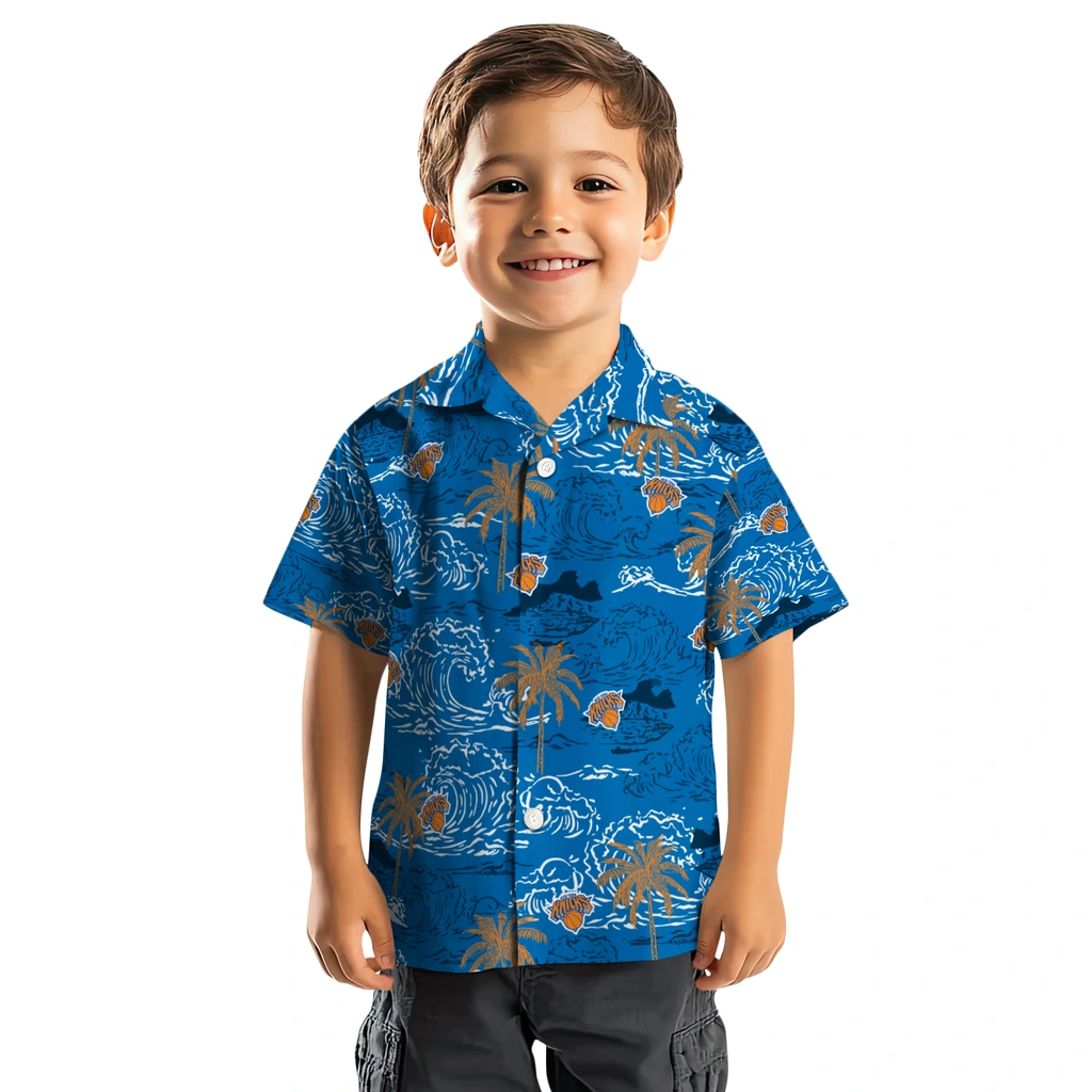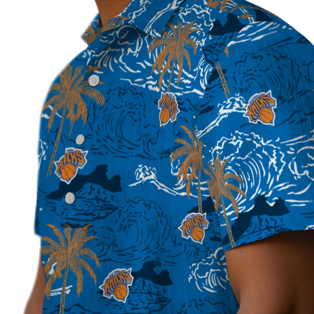 Show your New York Knicks spirit in tropical style. Palm trees and wave patterns paired with team logo for a tropical beach-inspired vibe. Available for men, women and kids. Great for matching looks.