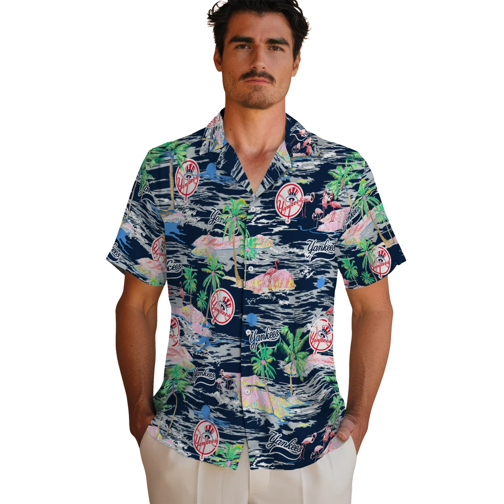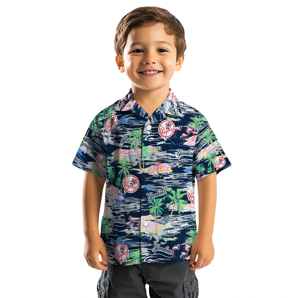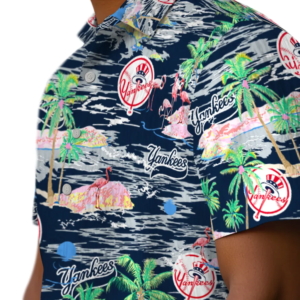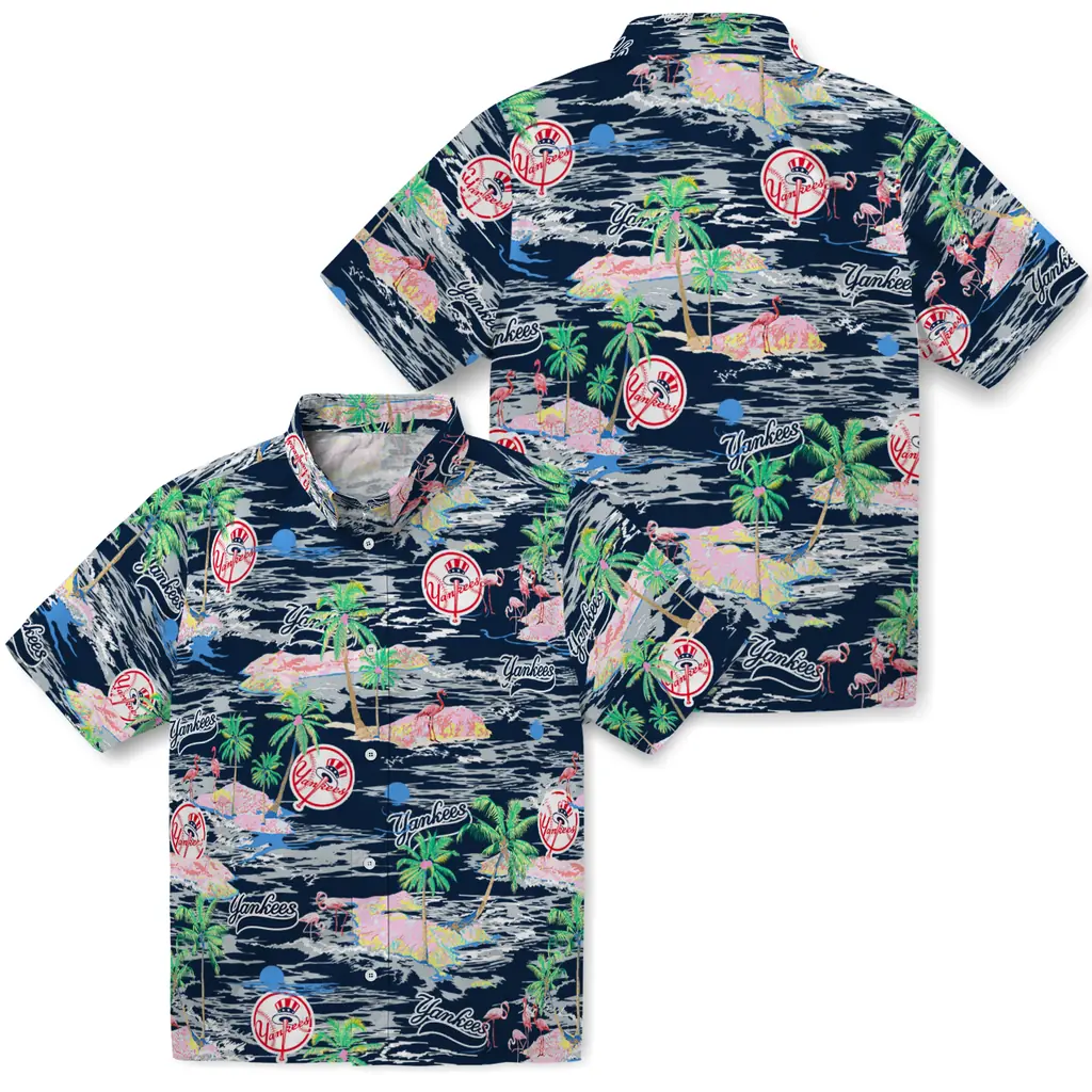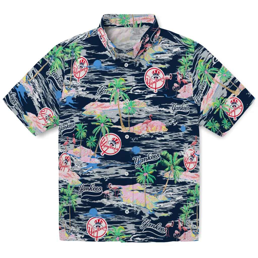 Show your New York Yankees spirit in tropical style. Beach island scenes with flamingos and team logo for a summer-ready Hawaiian shirt. Available for men, women and kids. Great for matching looks.
