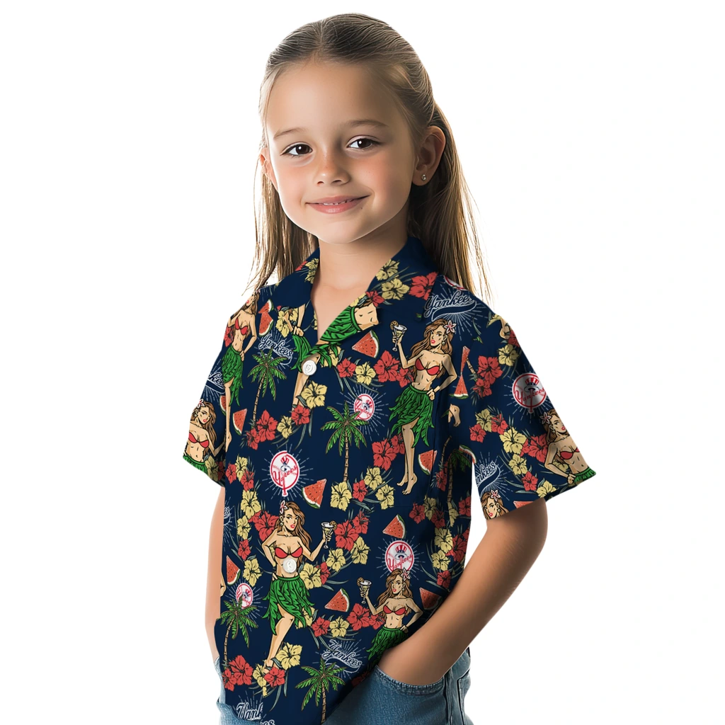 Show your New York Yankees spirit in tropical style. Colorful Hula girls illustration with tropical motifs and team logo for a playful design. Available for men, women and kids. Great for matching looks.
