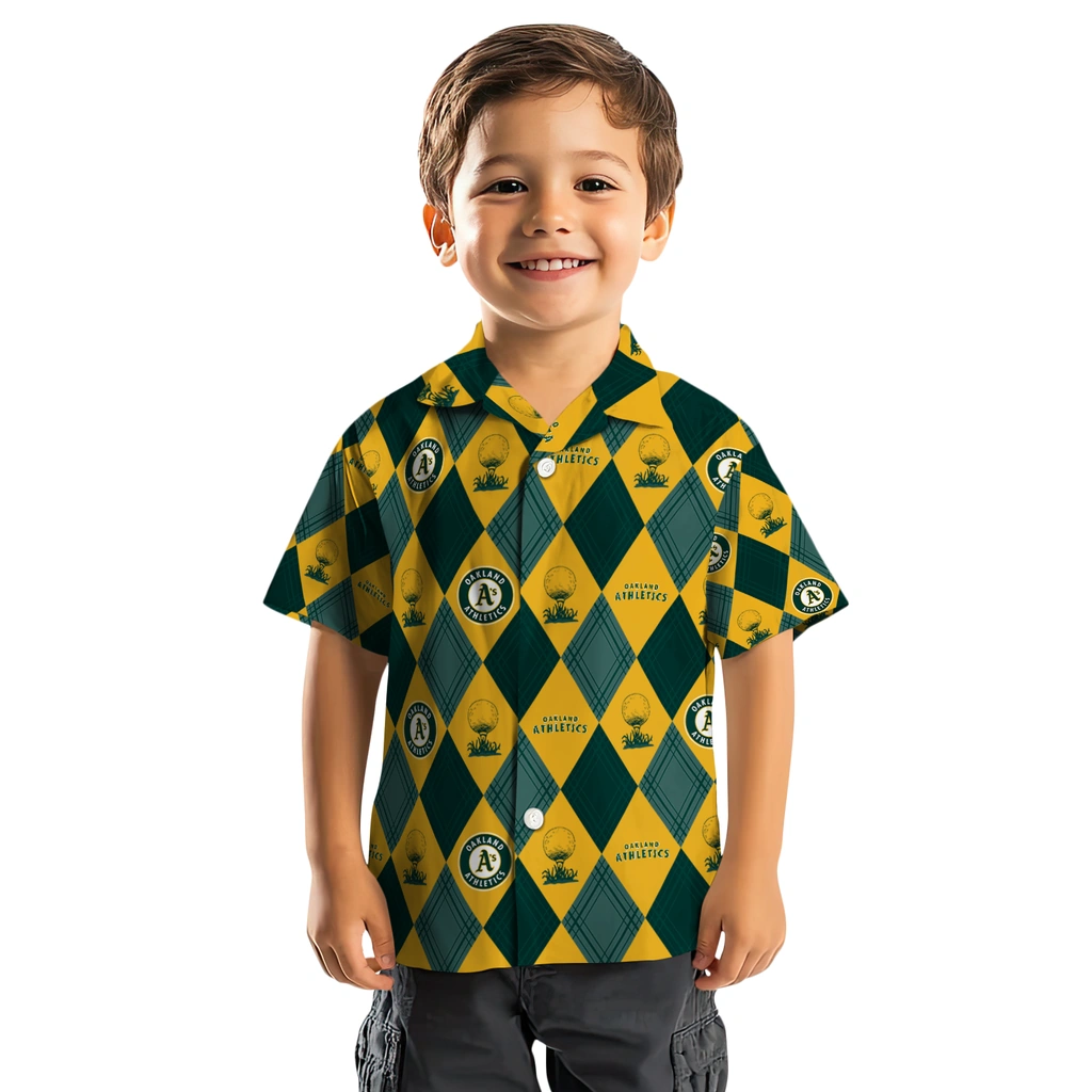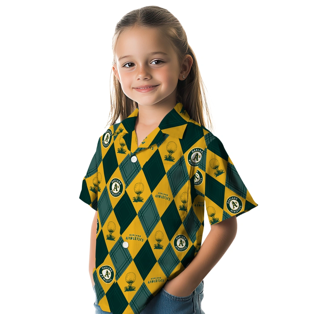 Show your Oakland Athletics spirit in tropical style. Golf ball and plaid pattern highlighted by team logo for a sporty tropical style. Available for men, women and kids. Great for matching looks.