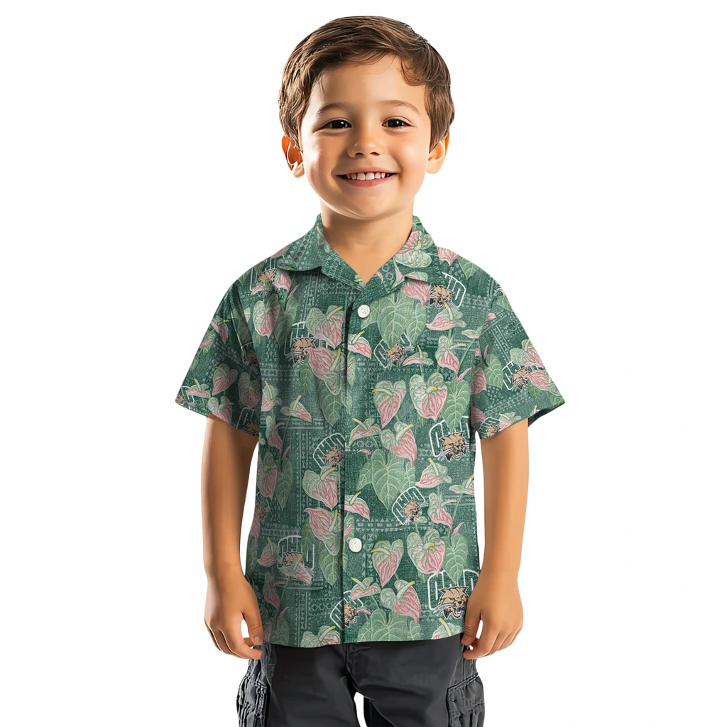 Show your Ohio Bobcats spirit in tropical style. Tropical leaves and anthurium accented with team logo for a vibrant Hawaiian shirt. Available for men, women and kids. Great for matching looks.