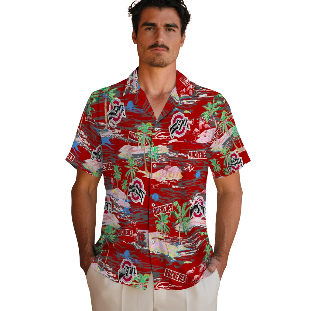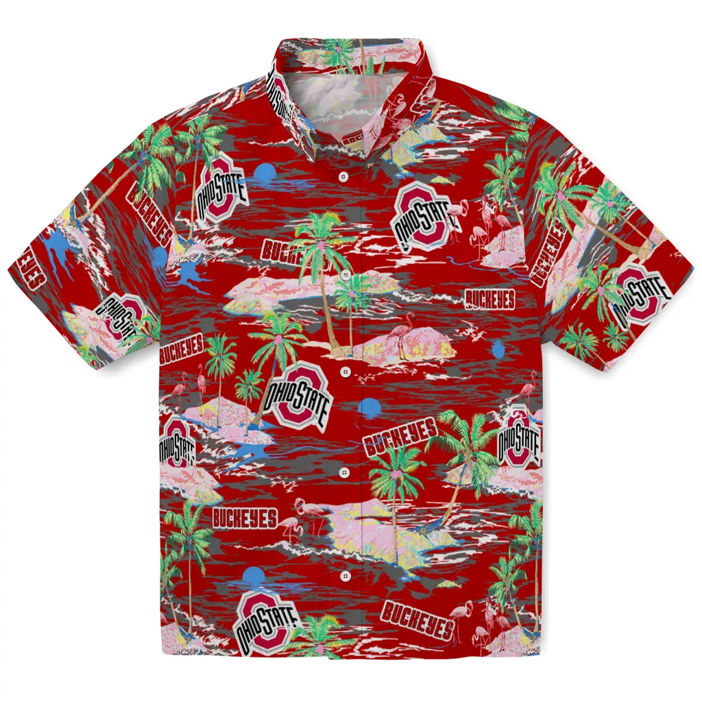 Show your Ohio State Buckeyes spirit in tropical style. Beach island scenes with flamingos and team logo for a summer-ready Hawaiian shirt. Available for men, women and kids. Great for matching looks.