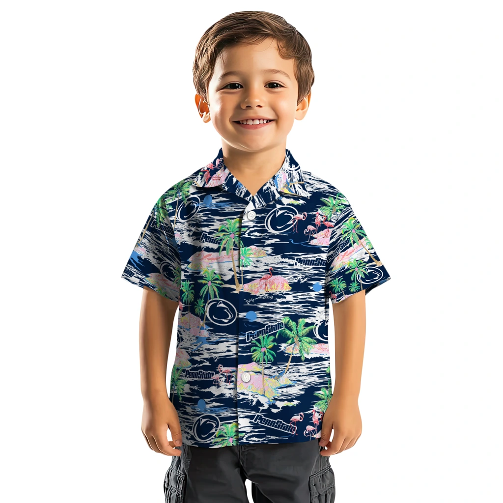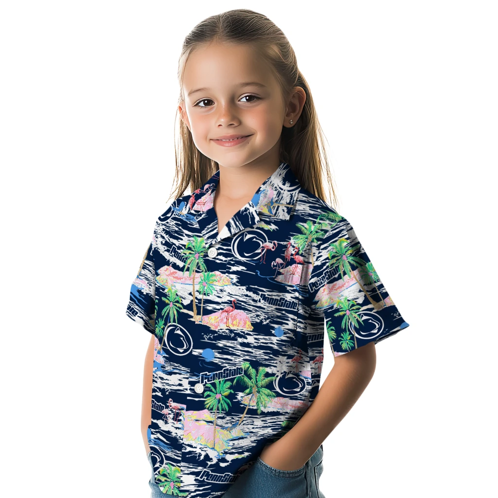 Show your Penn State Nittany Lions spirit in tropical style. Beach island scenes with flamingos and team logo for a summer-ready Hawaiian shirt. Available for men, women and kids. Great for matching looks.