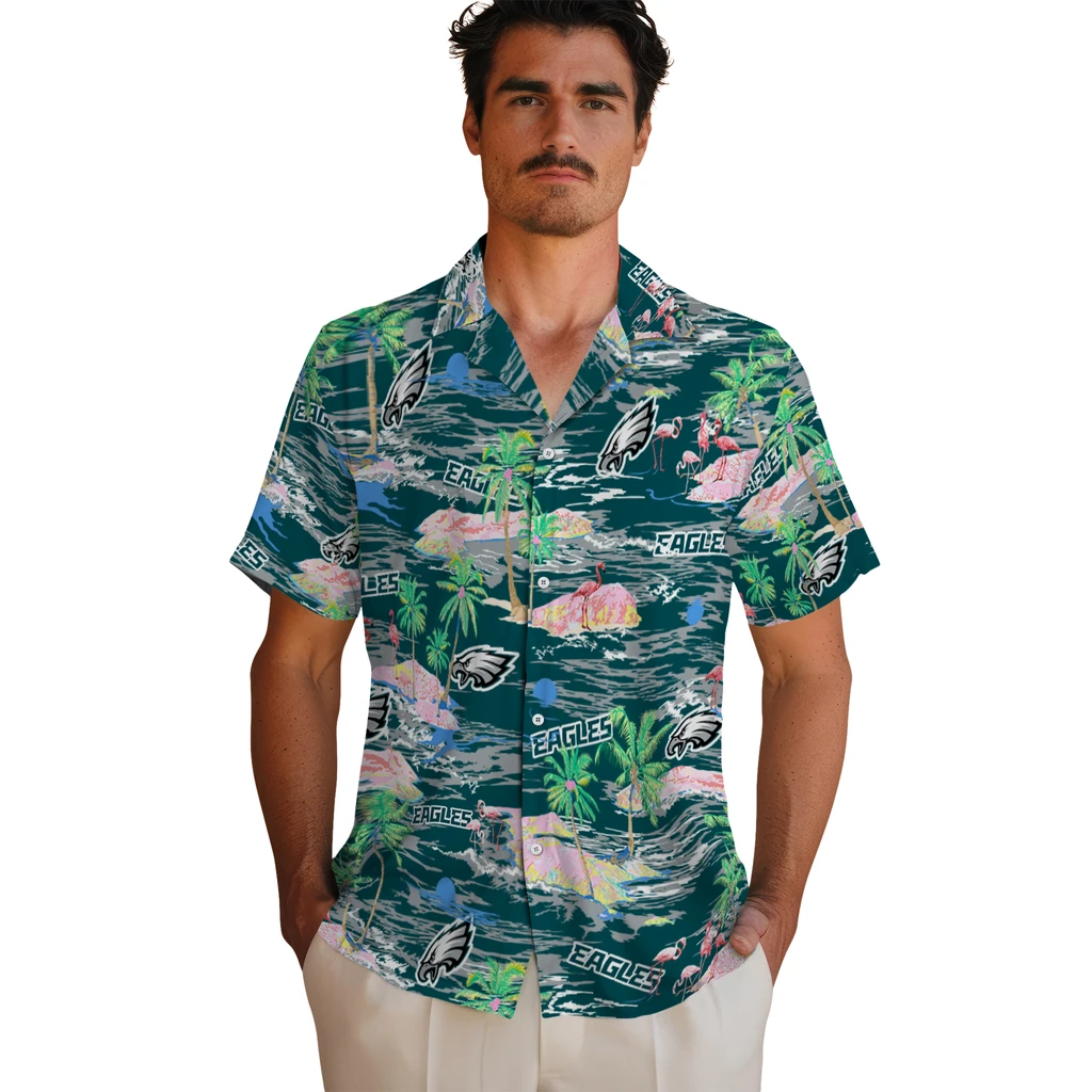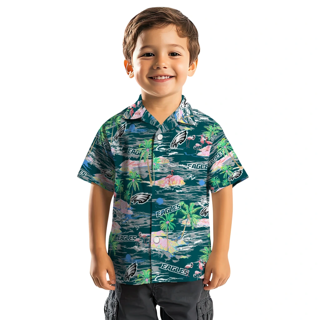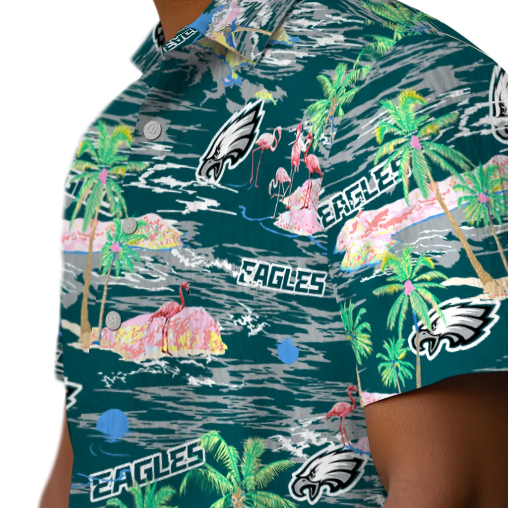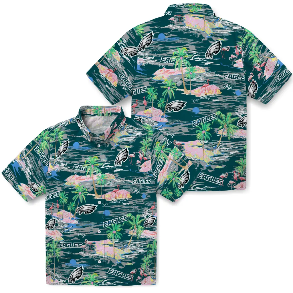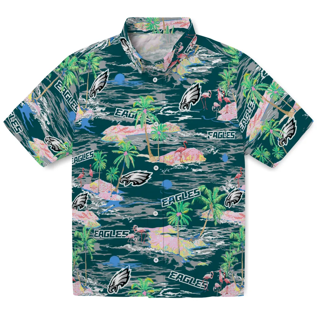 Show your Philadelphia Eagles spirit in tropical style. Beach island scenes with flamingos and team logo for a summer-ready Hawaiian shirt. Available for men, women and kids. Great for matching looks.