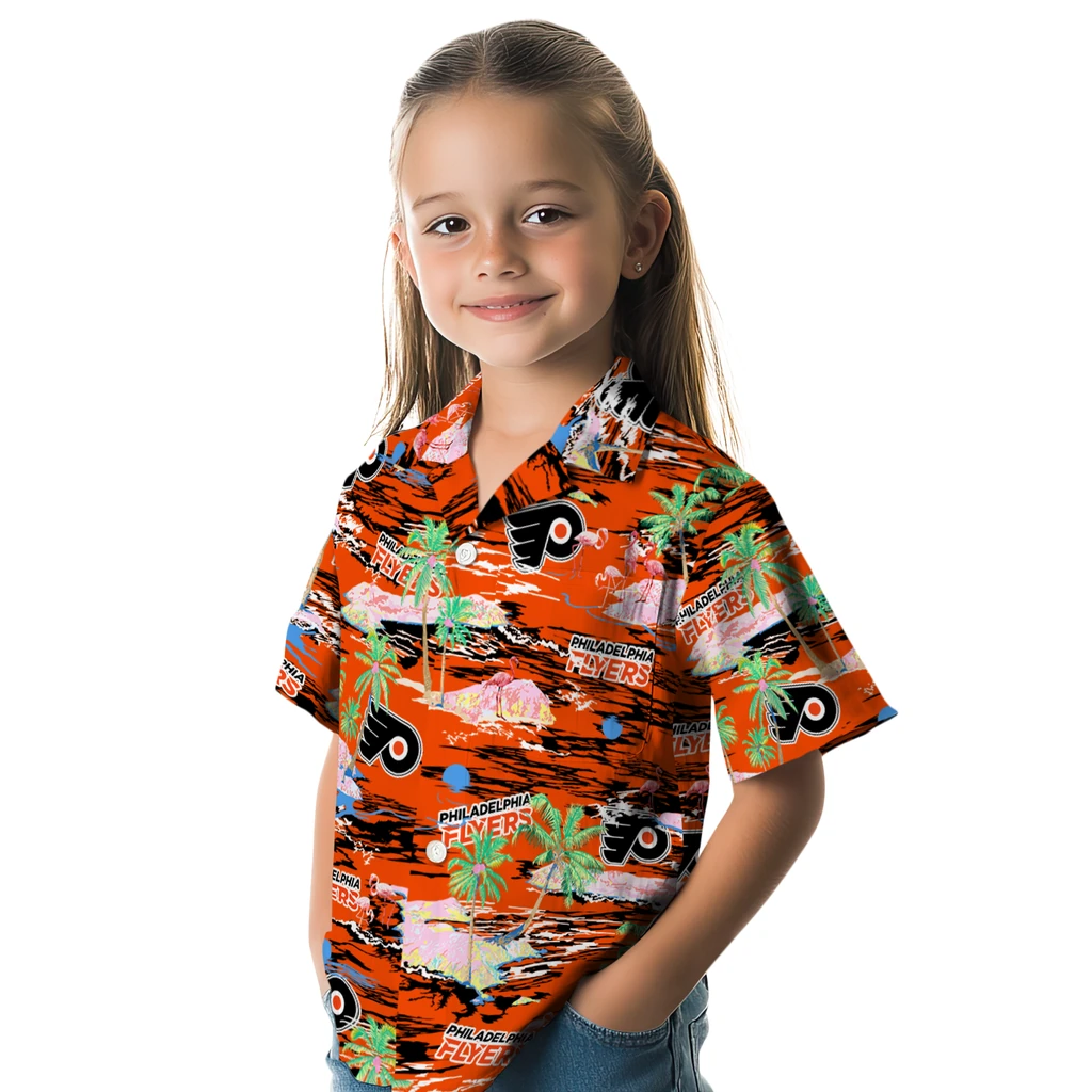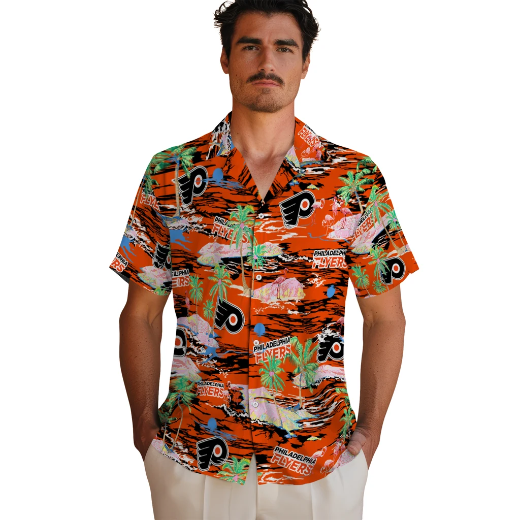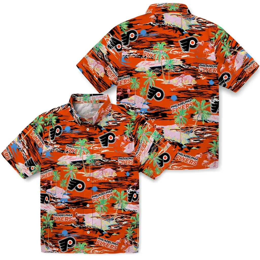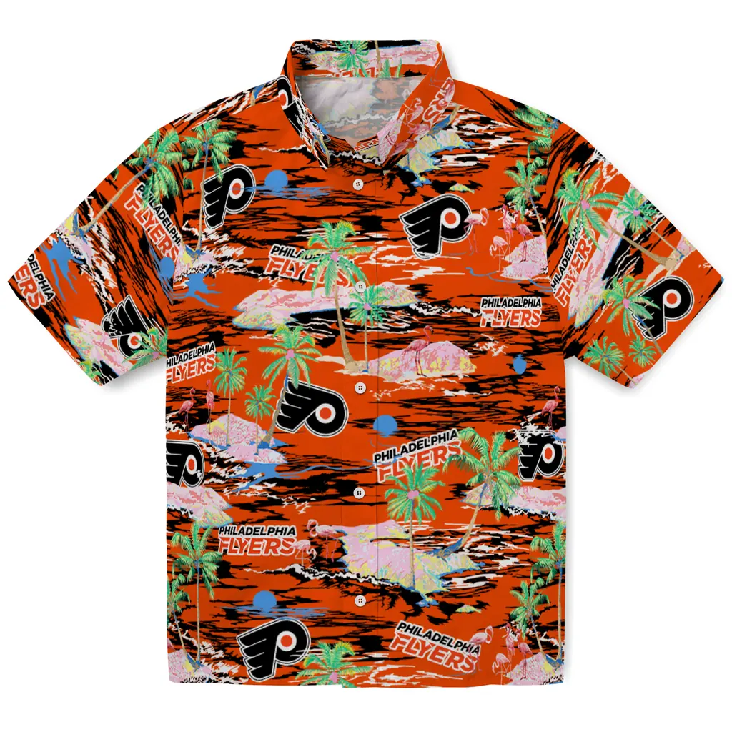 Show your Philadelphia Flyers spirit in tropical style. Beach island scenes with flamingos and team logo for a summer-ready Hawaiian shirt. Available for men, women and kids. Great for matching looks.