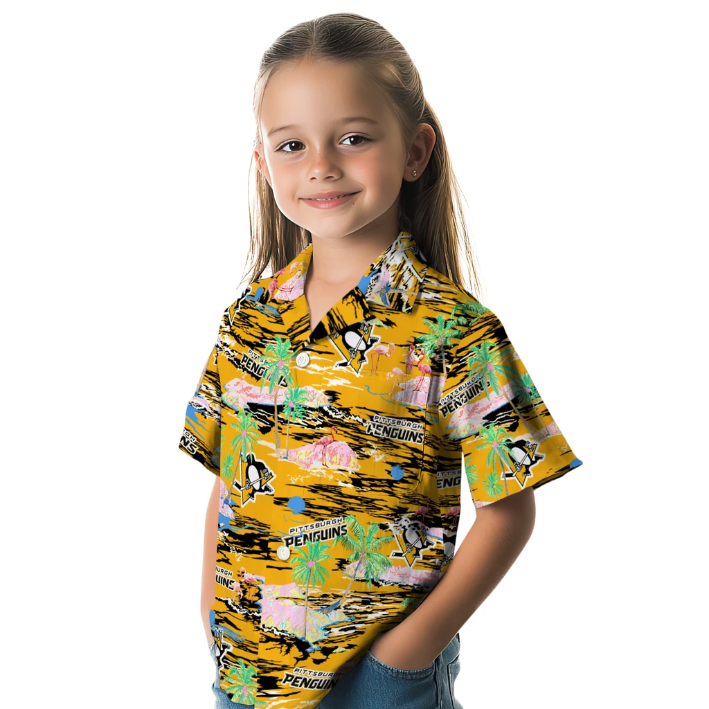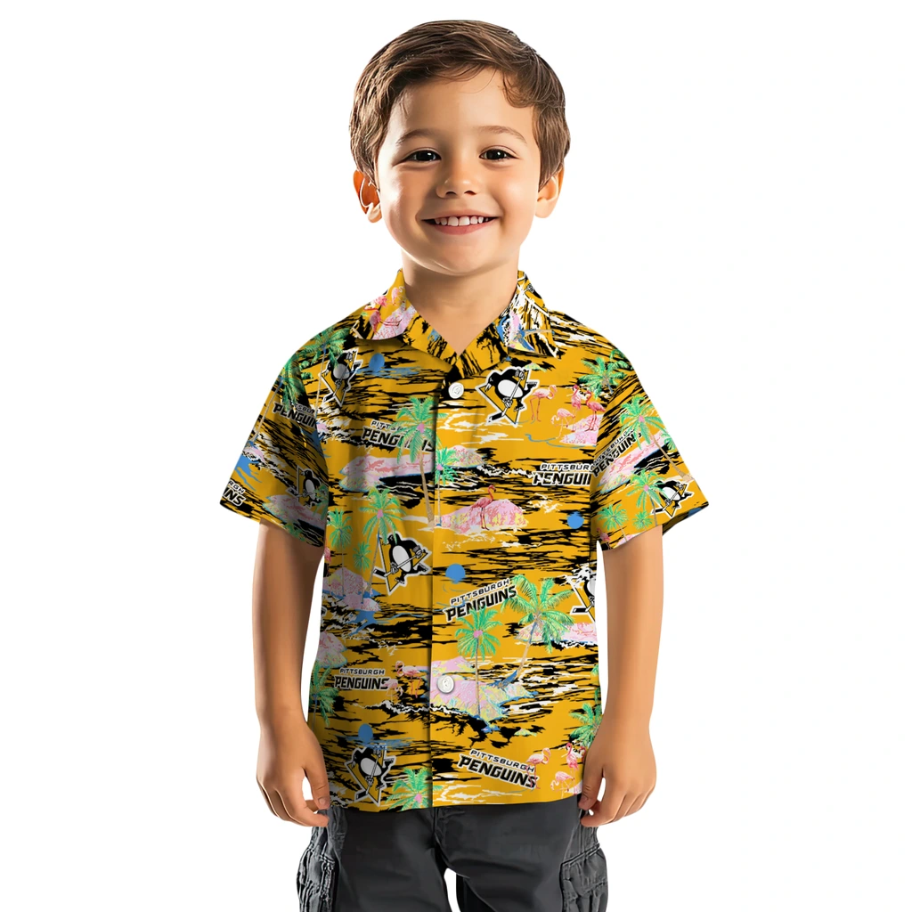 Show your Pittsburgh Penguins spirit in tropical style. Beach island scenes with flamingos and team logo for a summer-ready Hawaiian shirt. Available for men, women and kids. Great for matching looks.