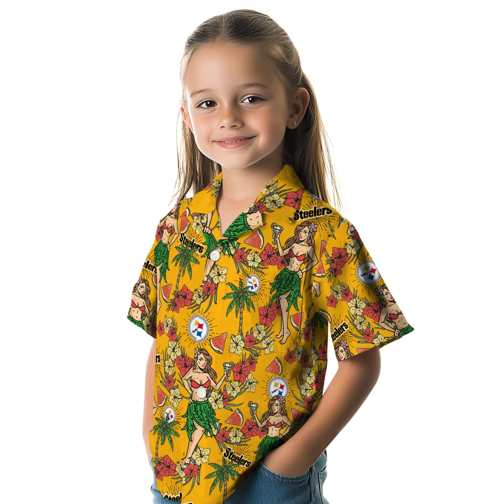 Show your Pittsburgh Steelers spirit in tropical style. Colorful Hula girls illustration with tropical motifs and team logo for a playful design. Available for men, women and kids. Great for matching looks.