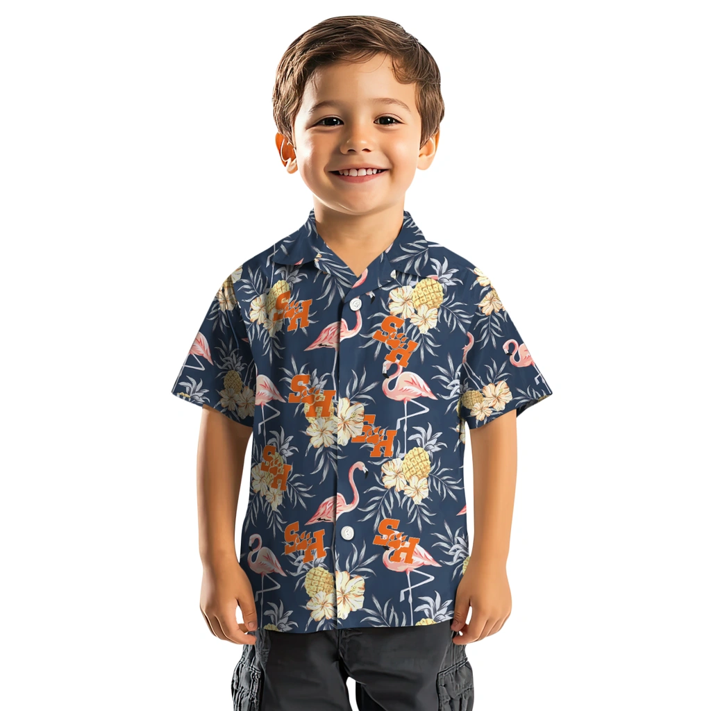 Show your Sam Houston Bearkats spirit in tropical style. Hibiscus flowers and flamingos accented with team logo for a bold tropical look. Available for men, women and kids. Great for matching looks.