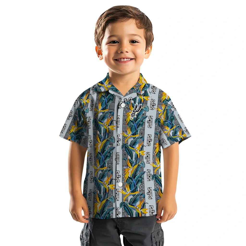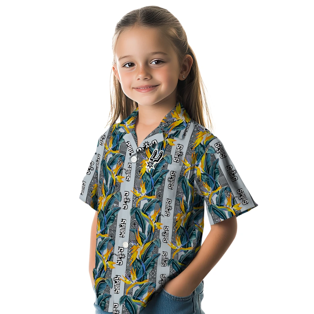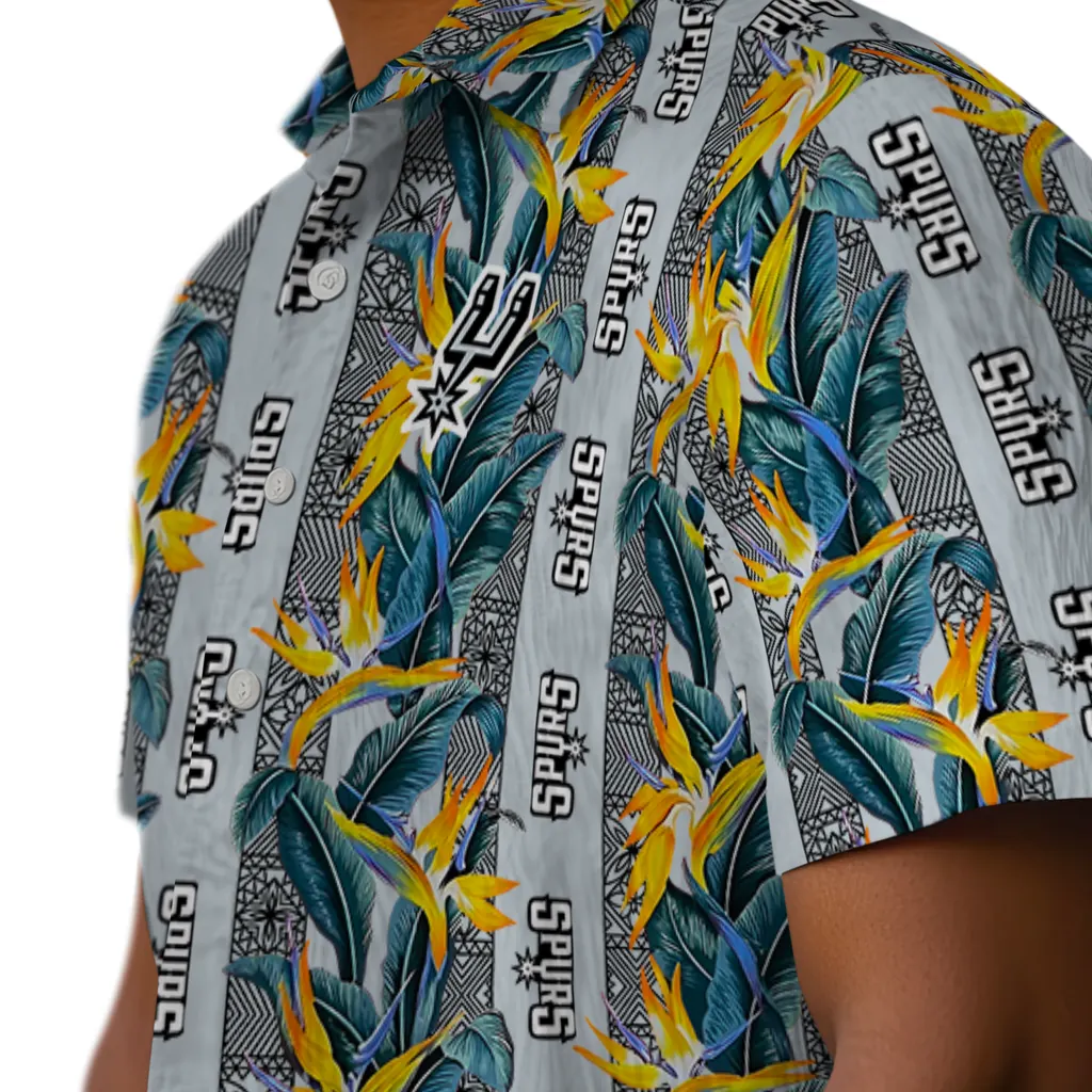 Show your San Antonio Spurs spirit in tropical style. Tropical paradise with Bird of Paradise flowers, tropical leaves, and team logo. Available for men, women and kids. Great for matching looks.